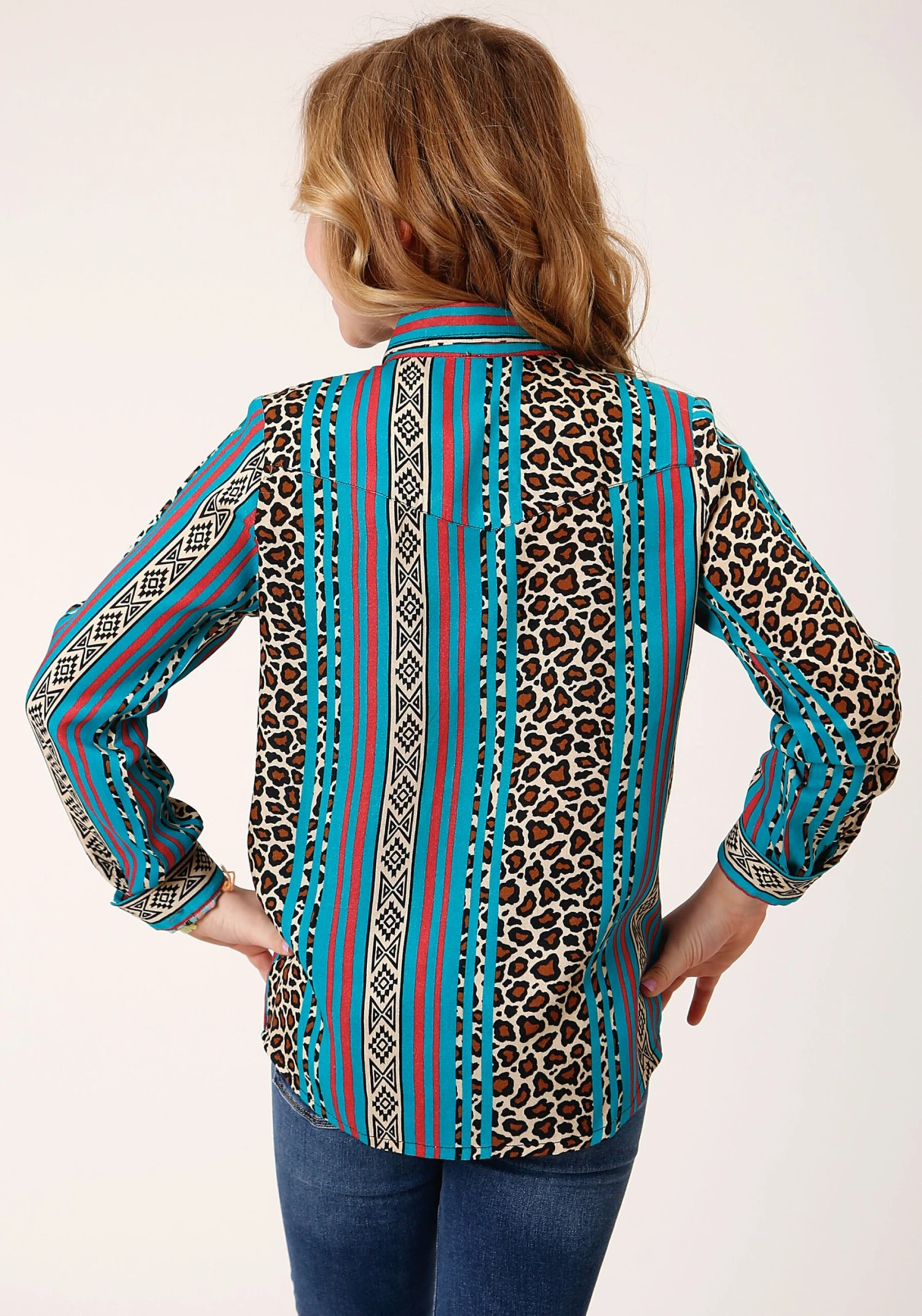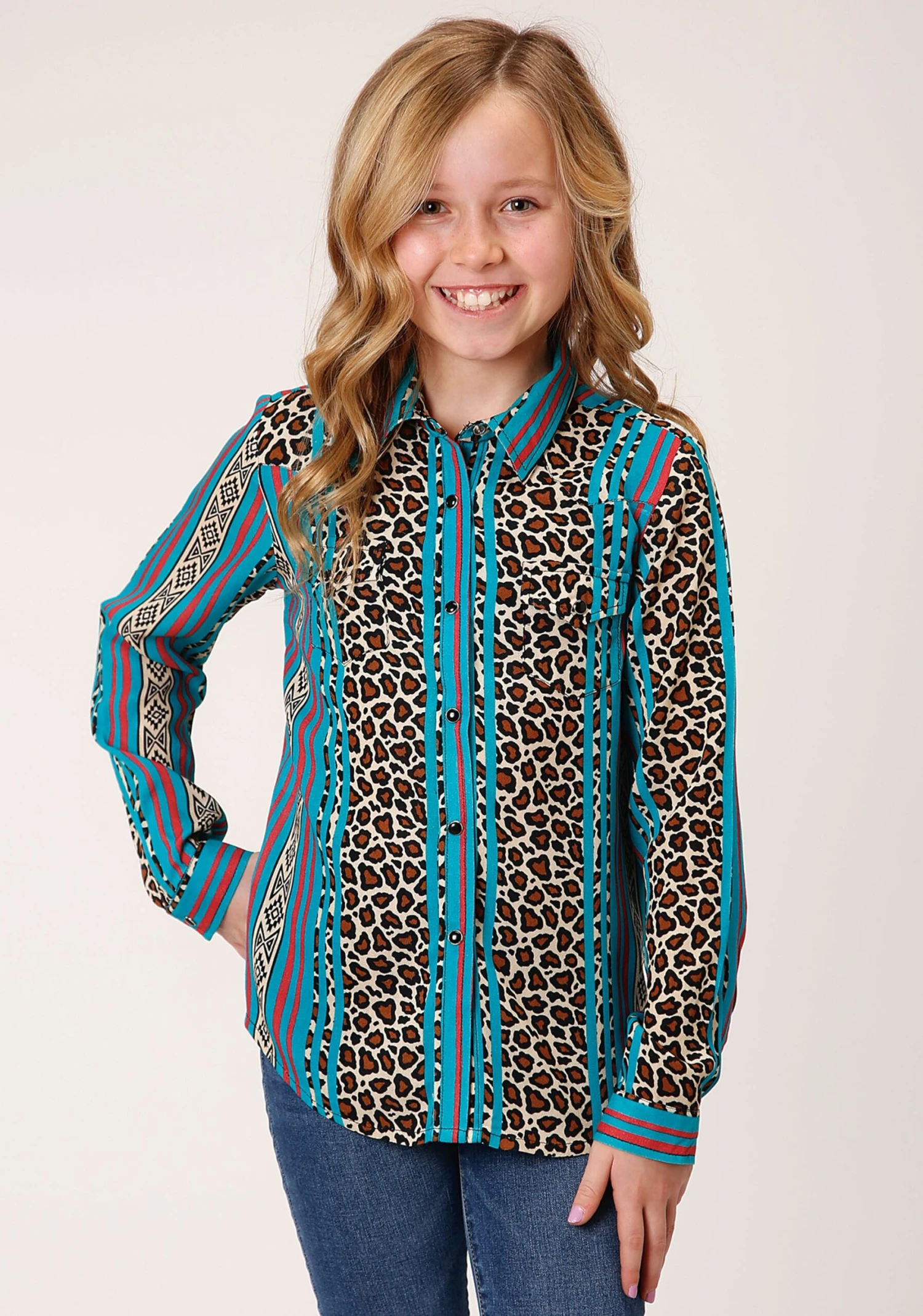 Girl’s Leopard Stripe Printed Rayon Western Blouse * Long Sleeve * 1 Pt Front & Back Yokes * 1Pt Curve Flap Pockets * Snap Closure * Garment Washed For Softness