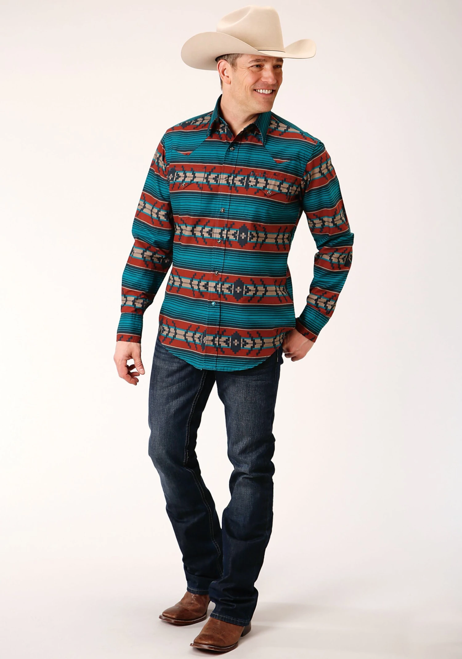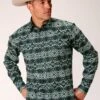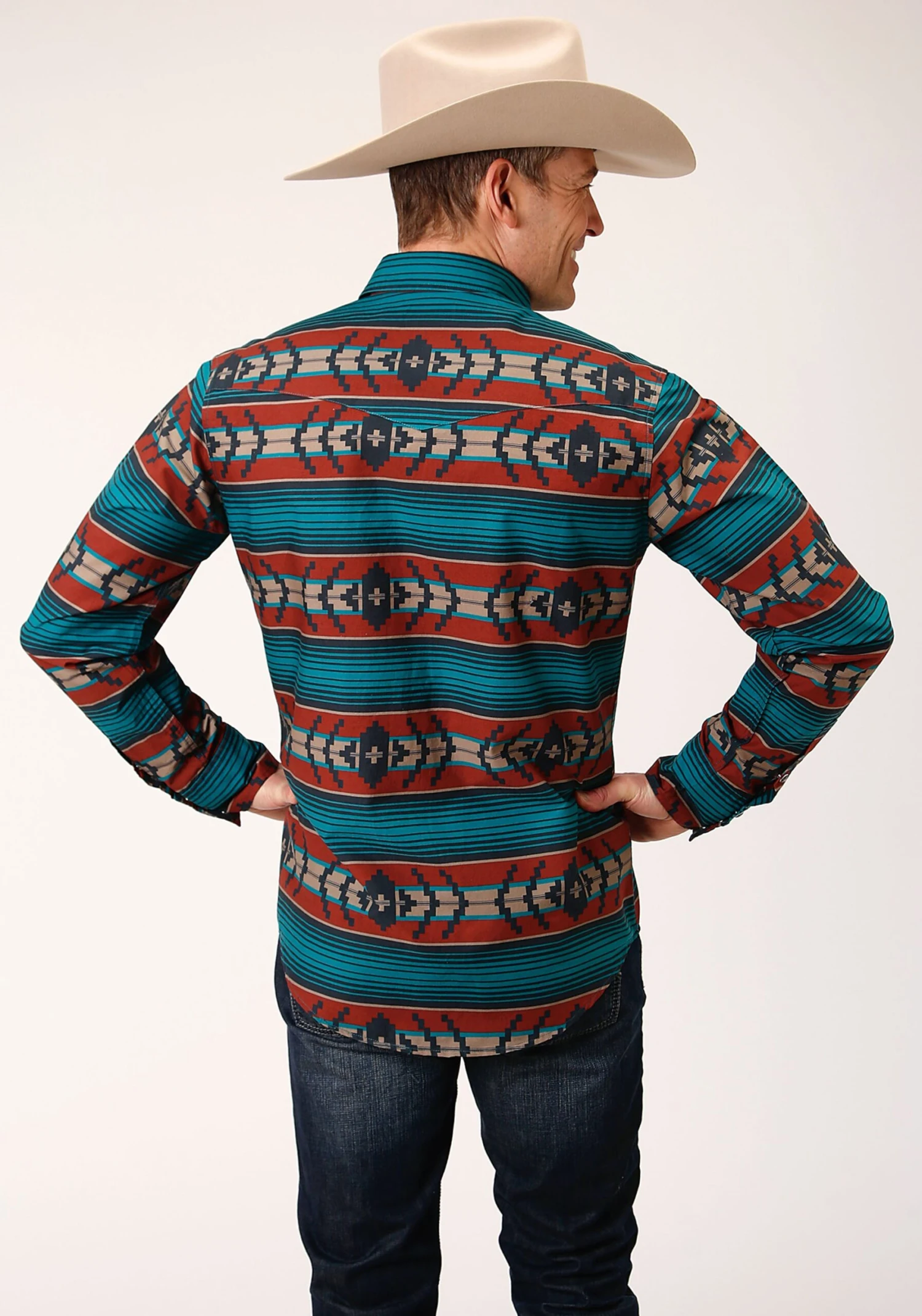 Men’s Long Sleeve Horizontal Aztec Print Shirt * 1 Pt Curved Front & Back Yokes * 1 Pt Curved Pockets & Snaps * 3 Snap Cuff * Khaki Variegated Snaps And 1 Turq Snap At Bottom Of CP * Garment Washed