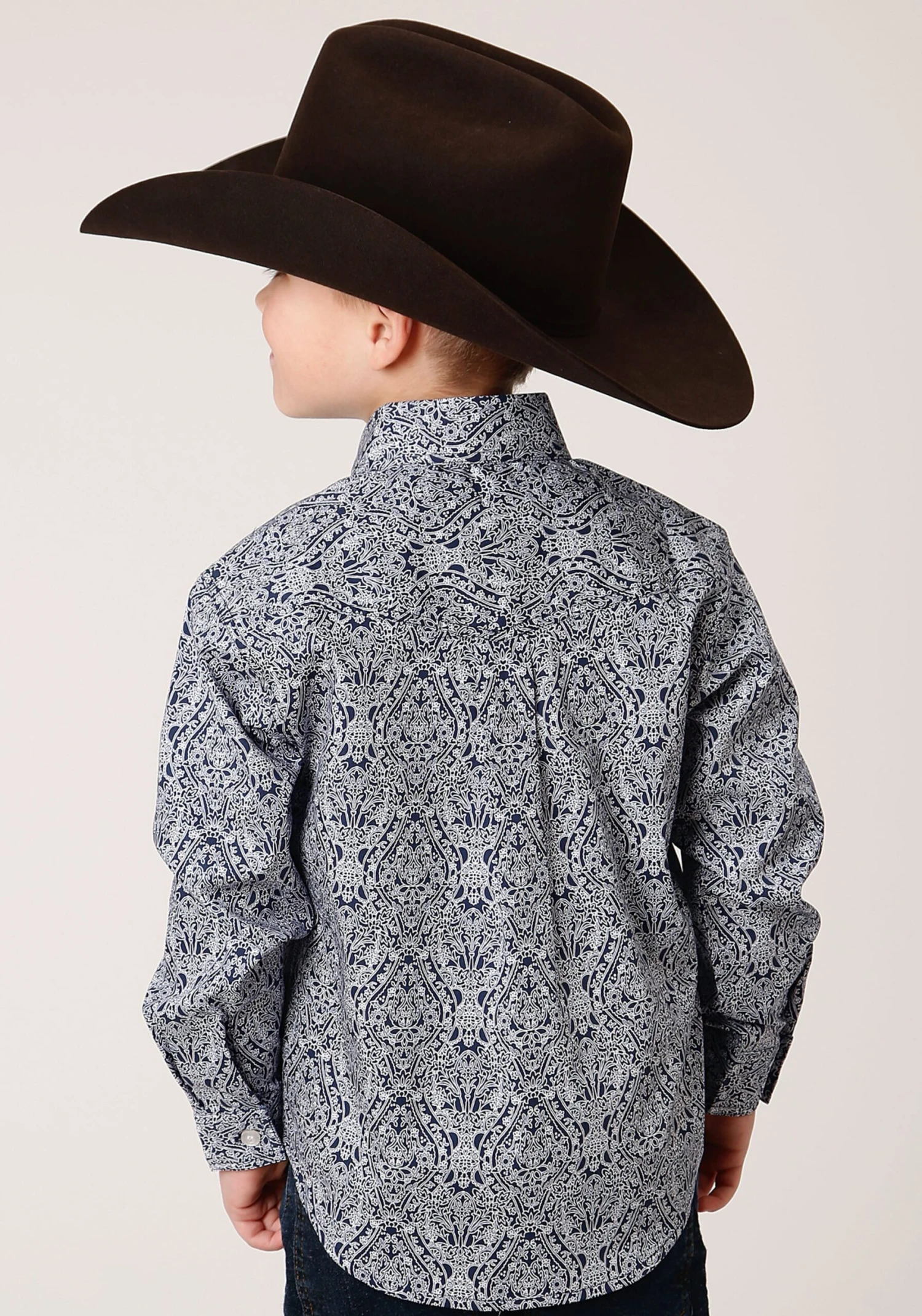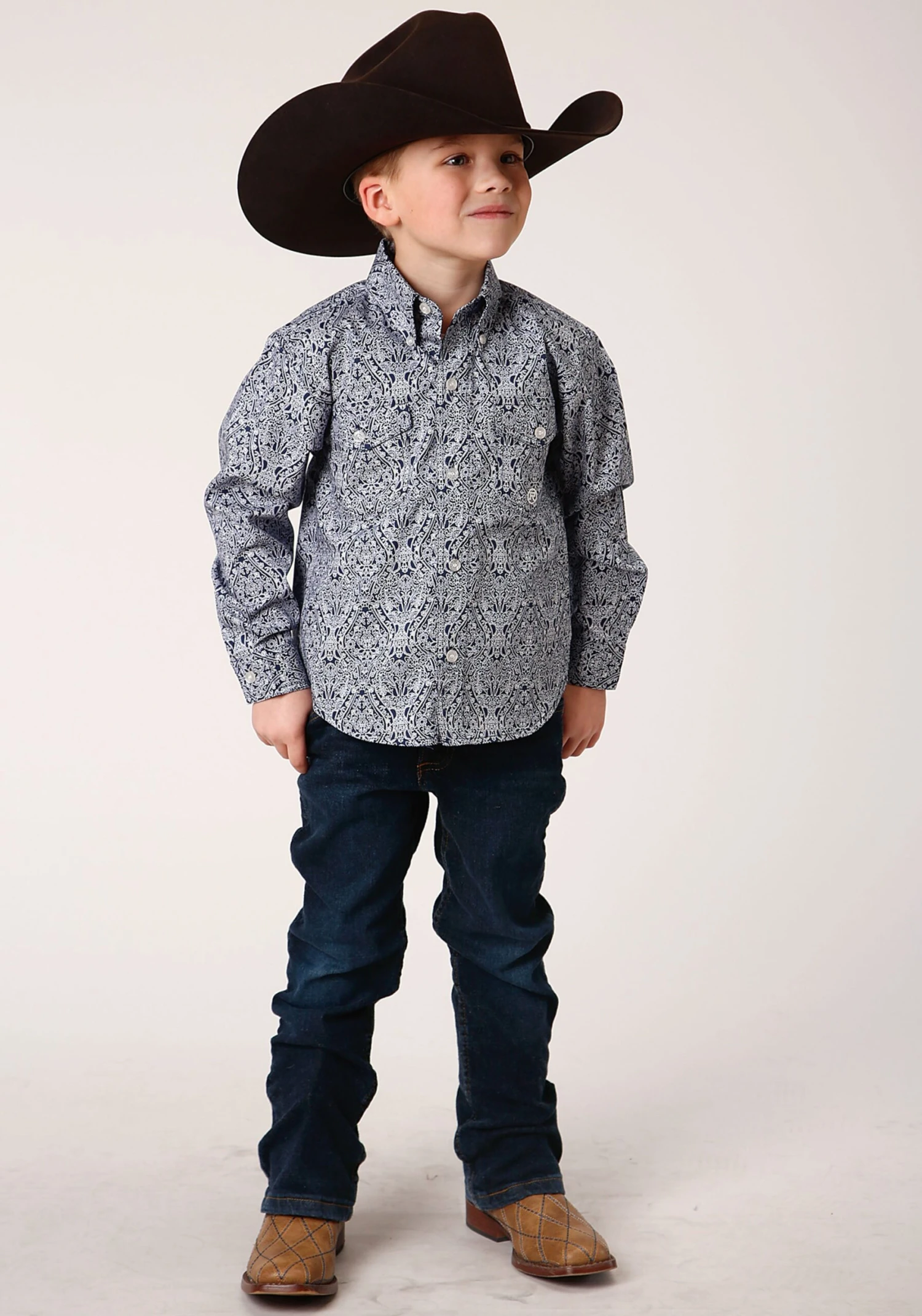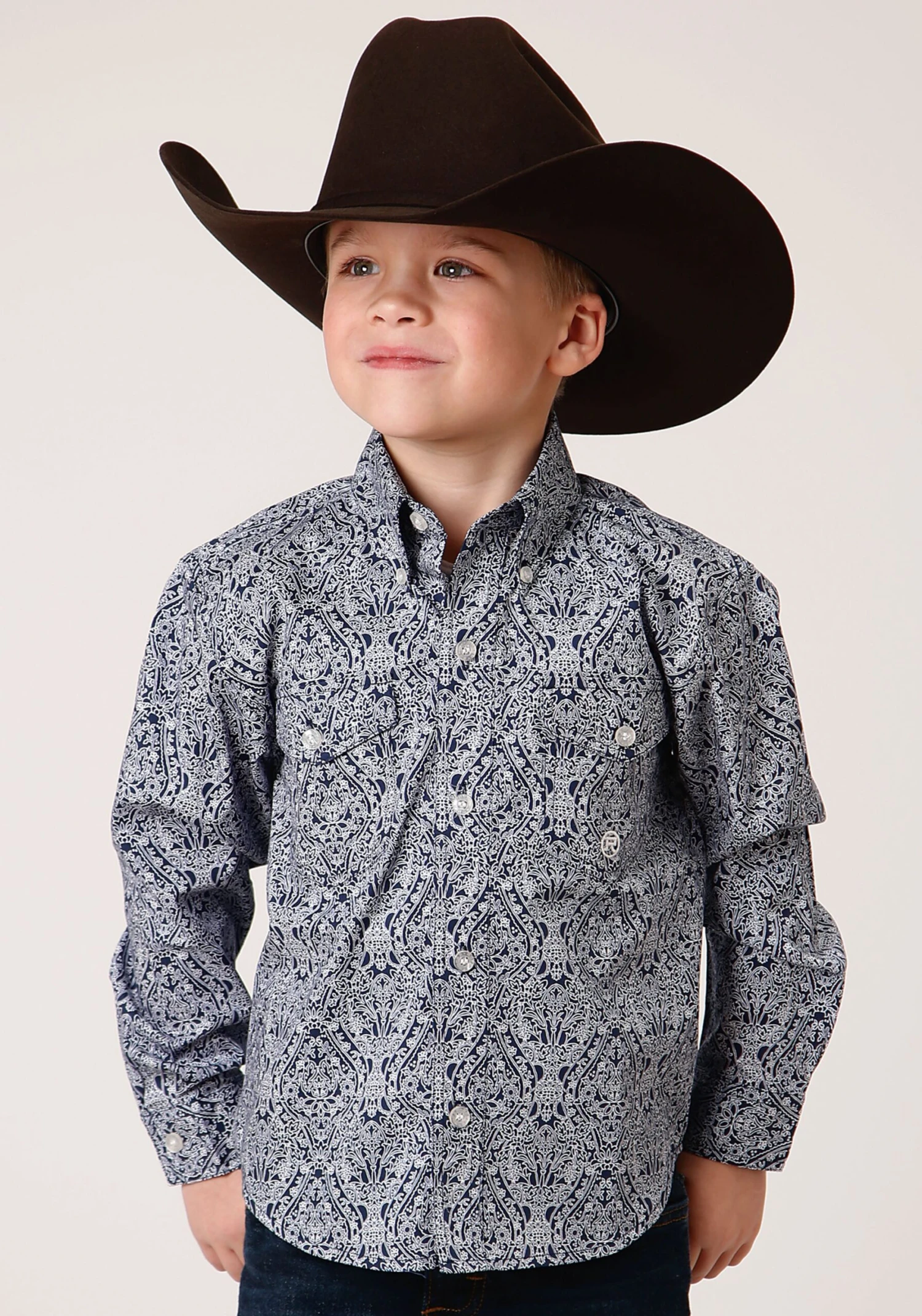 Boy’s Long Sleeve Western Shirt * Button Front * Button Down Collar * 1 Point Back Yoke W/Pleat & Locker Loop * 2 One Point Pockets & Flaps * Roper “R” Embroidery