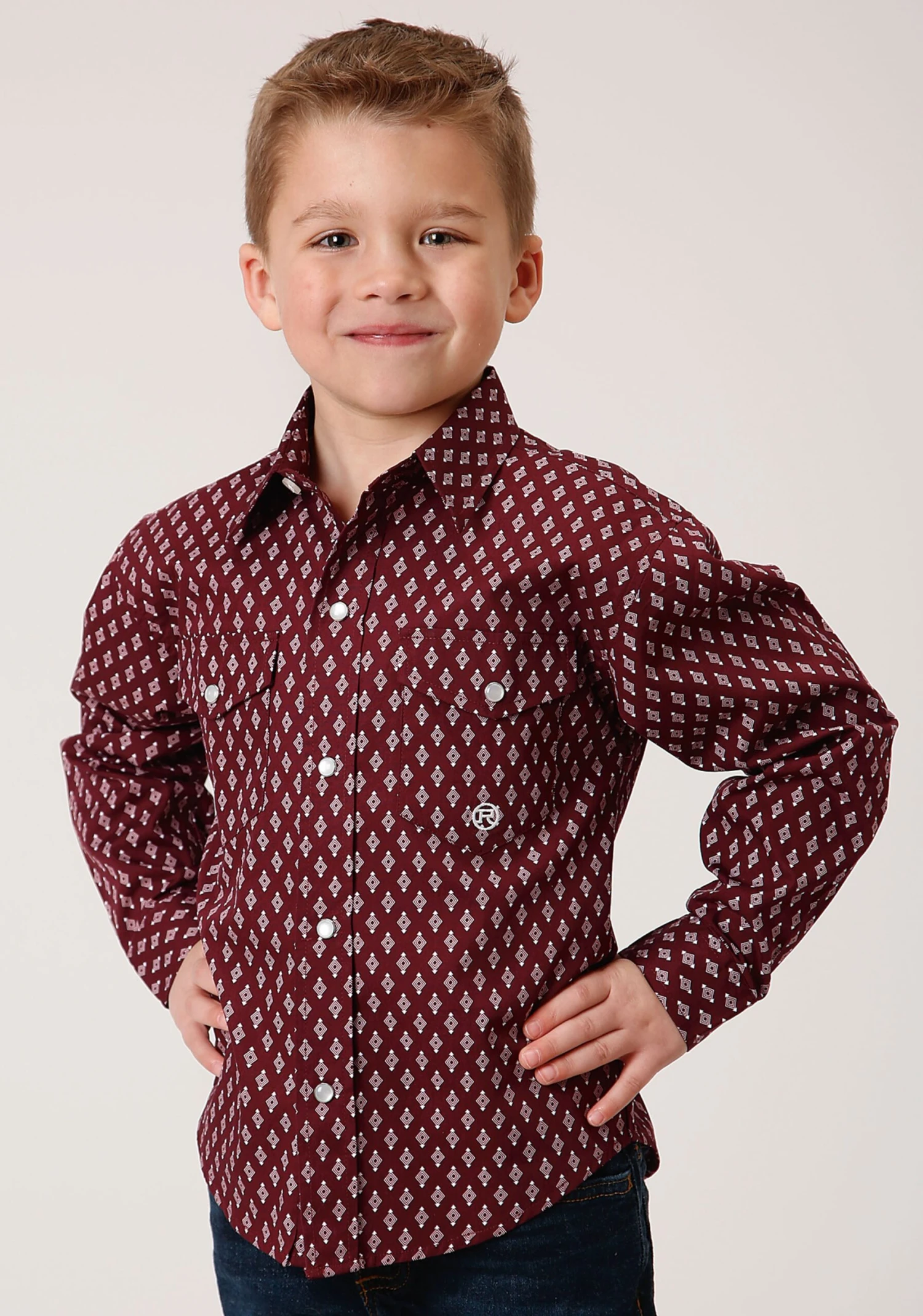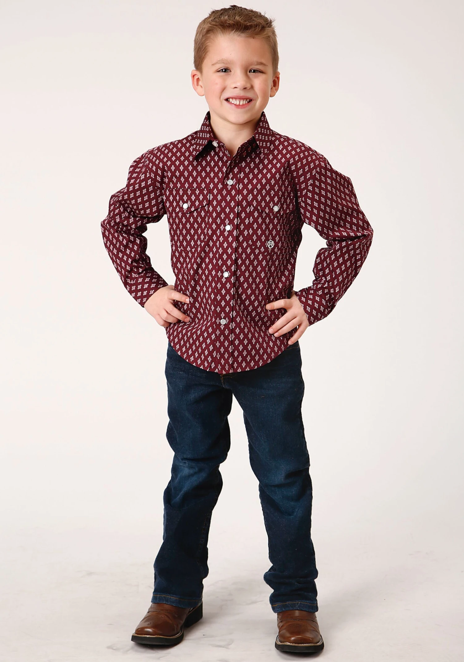 Boys Long Sleeve Western Shirt * Snap Front * Spread Collar * 1 Point Back Yoke * 2 One Point Pockets & Flaps * Roper “R” Embroidery