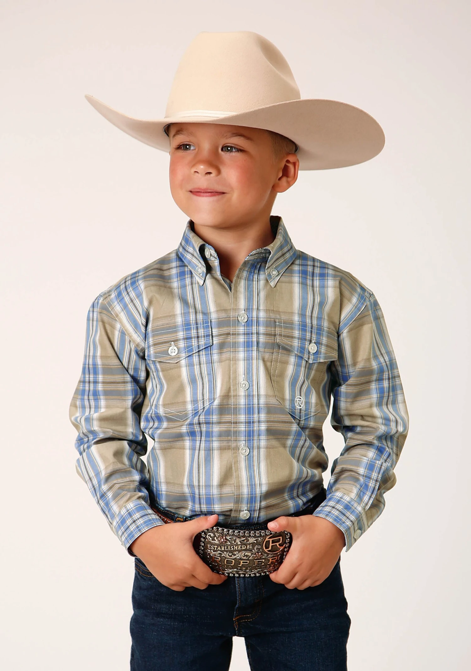 Boy’s Long Sleeve Western Shirt * Button Front * Button Down Collar * 1 Point Back Yoke W/Pleat & Locker Loop * 2 One Point Pockets & Flaps * Roper “R”