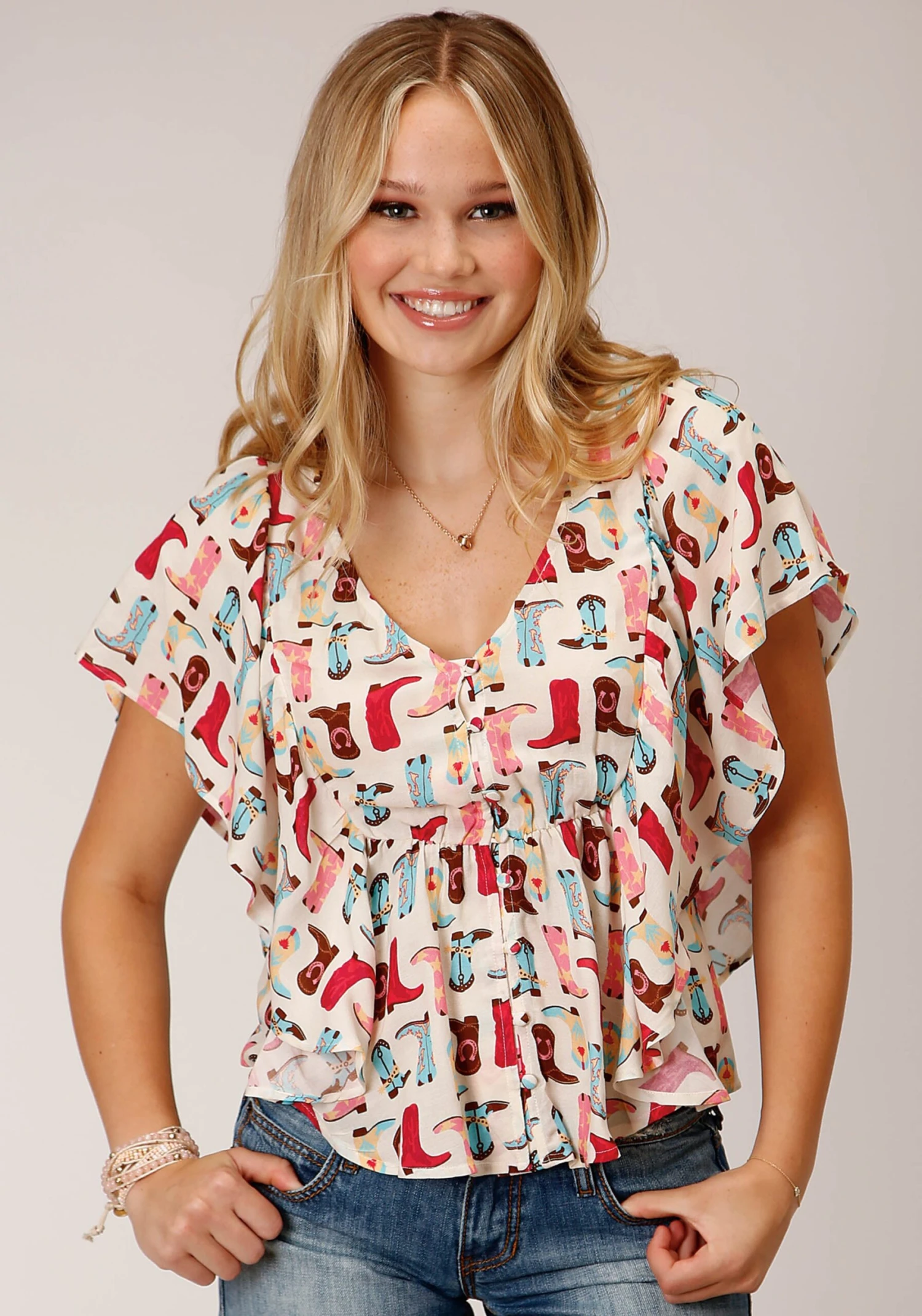 Women’s Boot Printed Rayon Peasant Blouse * Dolman Short Sleeves * Deep ‘V’ Neckline * Shirred Waist With Elastic * Button Front Closure * Garment Washed For Softness