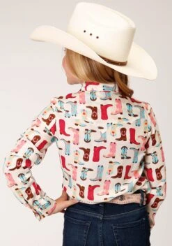 Girl’s Boot Printed Rayon Western Blouse * Long Sleeve * 1 Pt Front Yoke * Fancy 3 Pt Back Yoke * No Pockets * Snap Closure