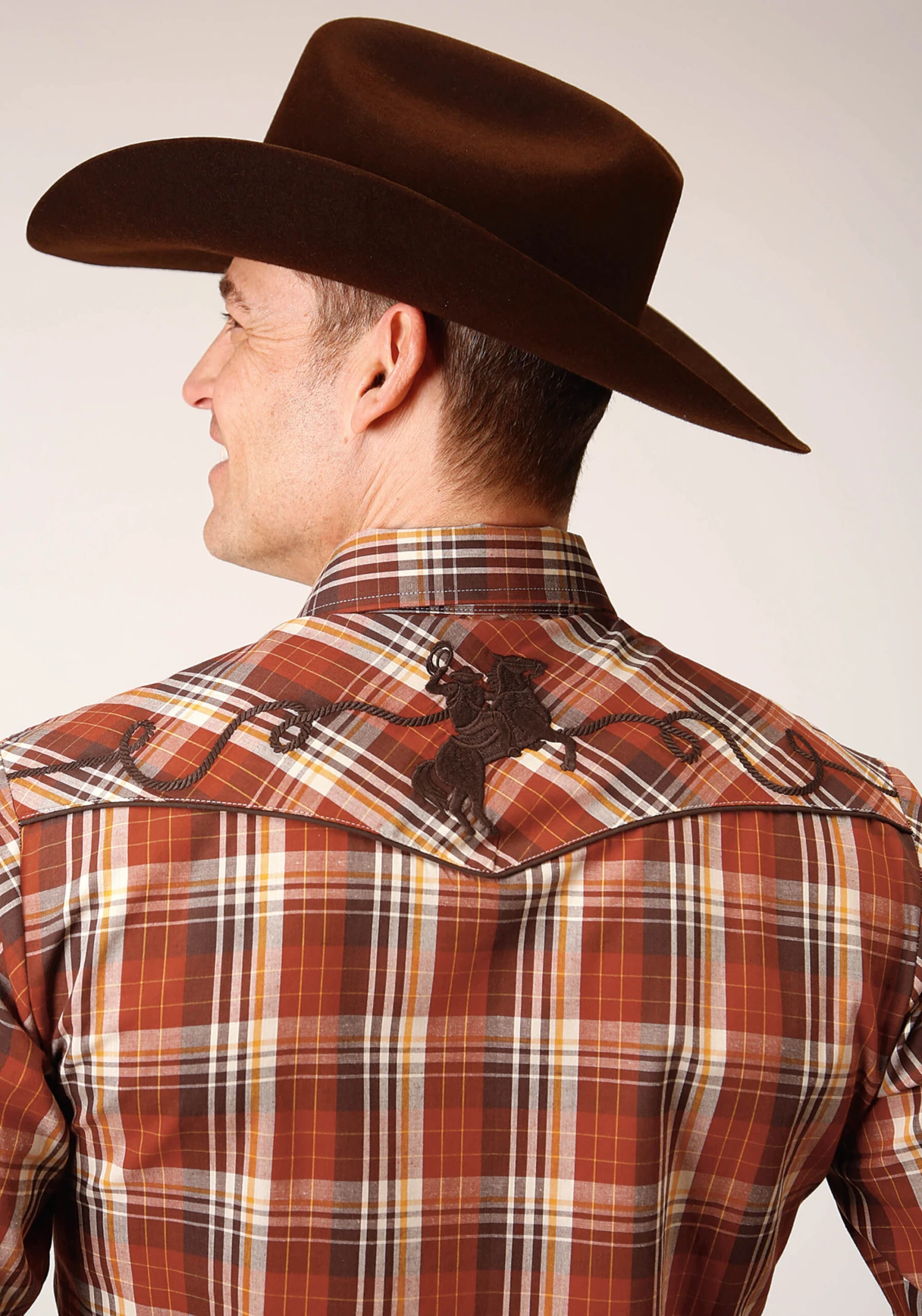Men’s Long Sleeve Western Style Shirt * Curved 1 Pt Back Yoke * Plaid Cotton/Poly Broadcloth * Trimmed W/Solid Piping * Smile Pockets W/Arrow Points * Snap Front * 3 Snap Cuff * Embroidery On Back Yoke
