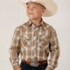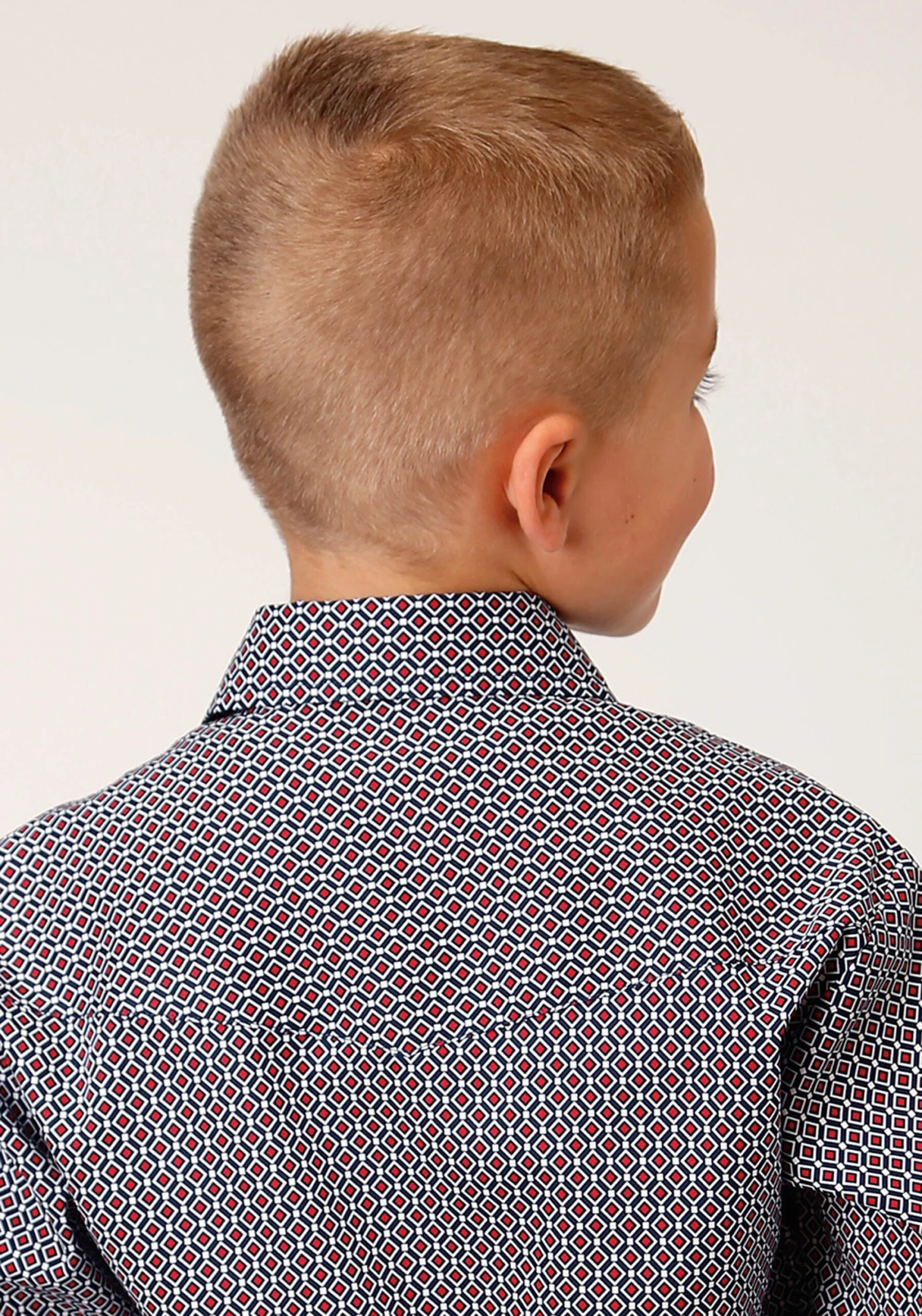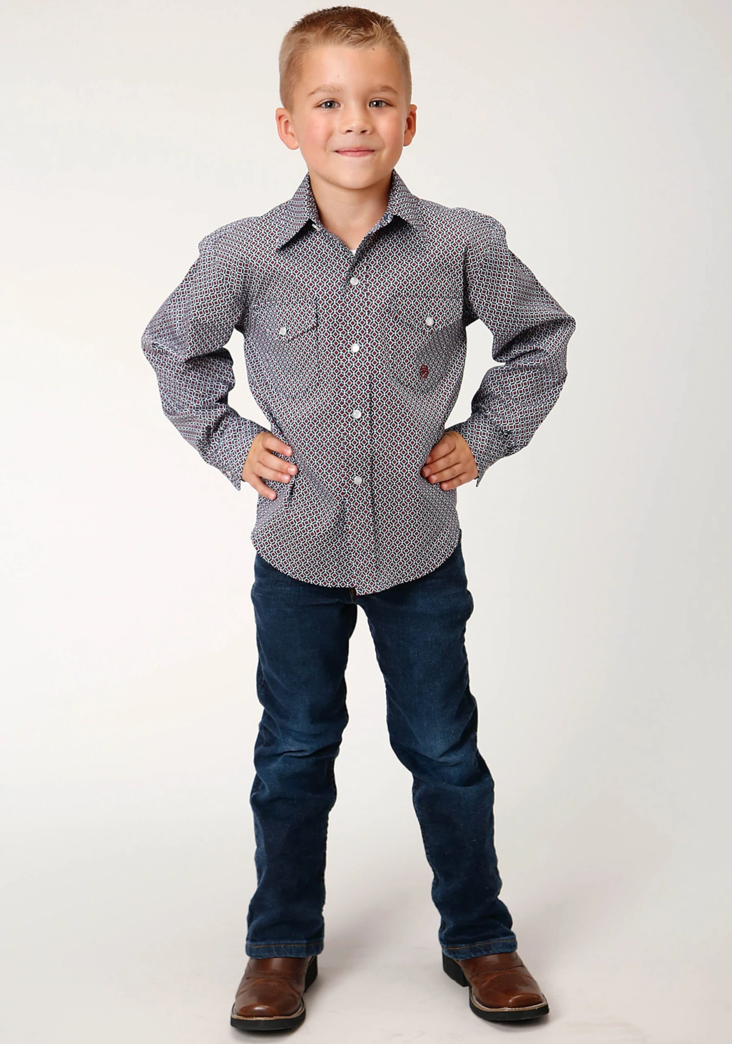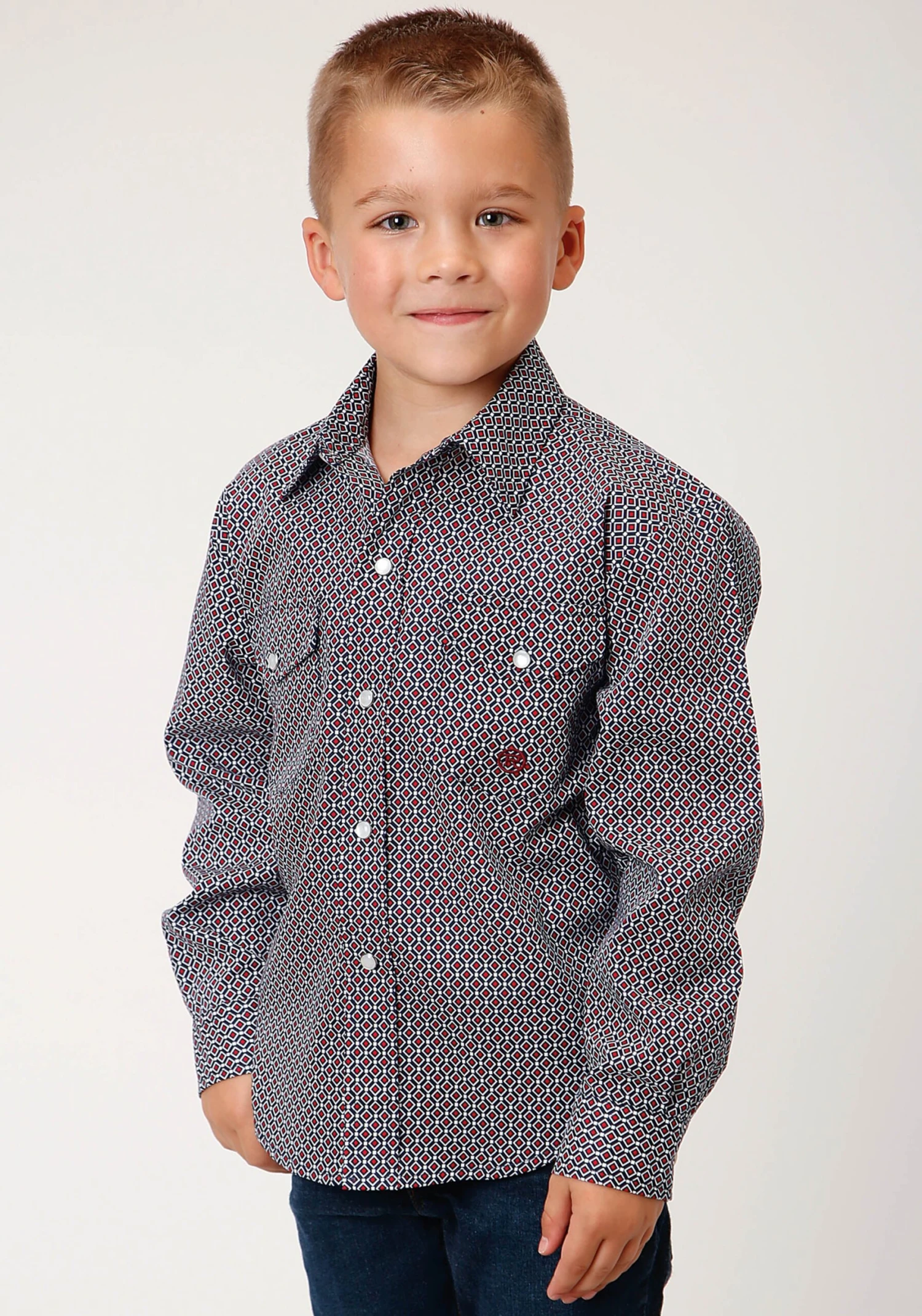 Boys Long Sleeve Western Shirt * Snap Front * Spread Collar * 1 Point Back Yoke * 2 One Point Pockets & Flaps * Roper “R” Embroidery