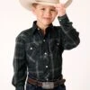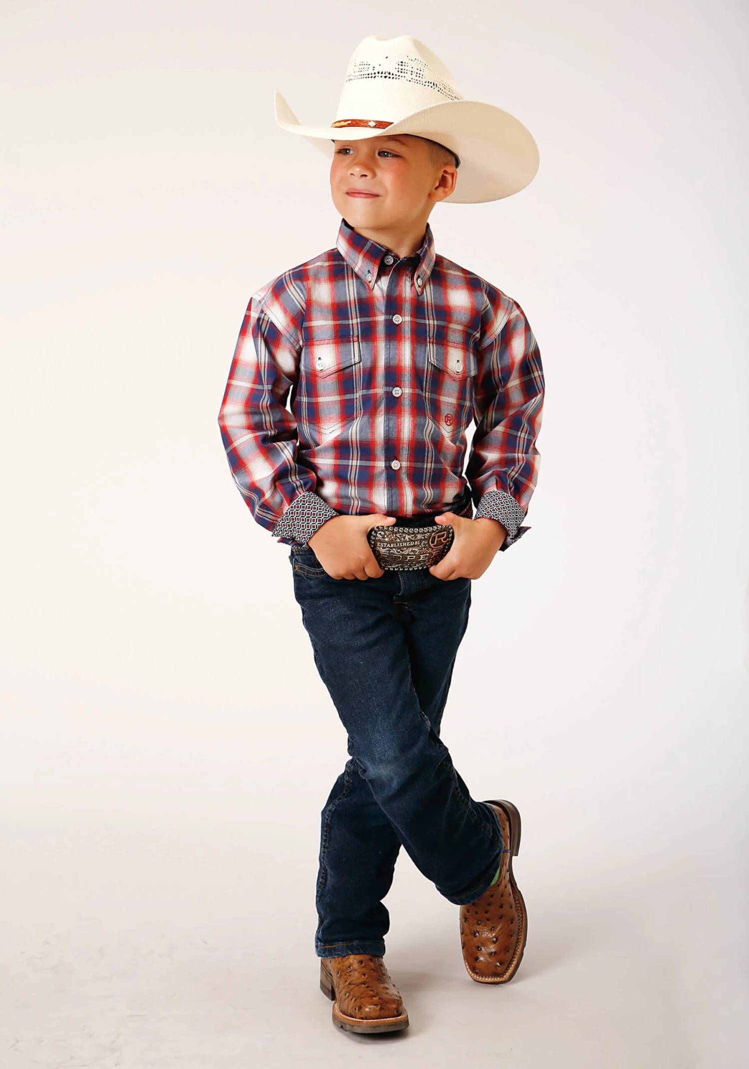 Boy’s Long Sleeve Western Shirt * Button Front * Button Down Collar * 1 Point Back Yoke W/Pleat & Locker Loop * 2 One Point Pockets & Flaps * Roper “R”
