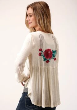 Women’s Cream Rayon Crepe Short Length Cardigan * Long Sleeve * Embroidery Embellishment On Front & Back Yokes * Shirt Tail Hem * Garment Washed For Softness