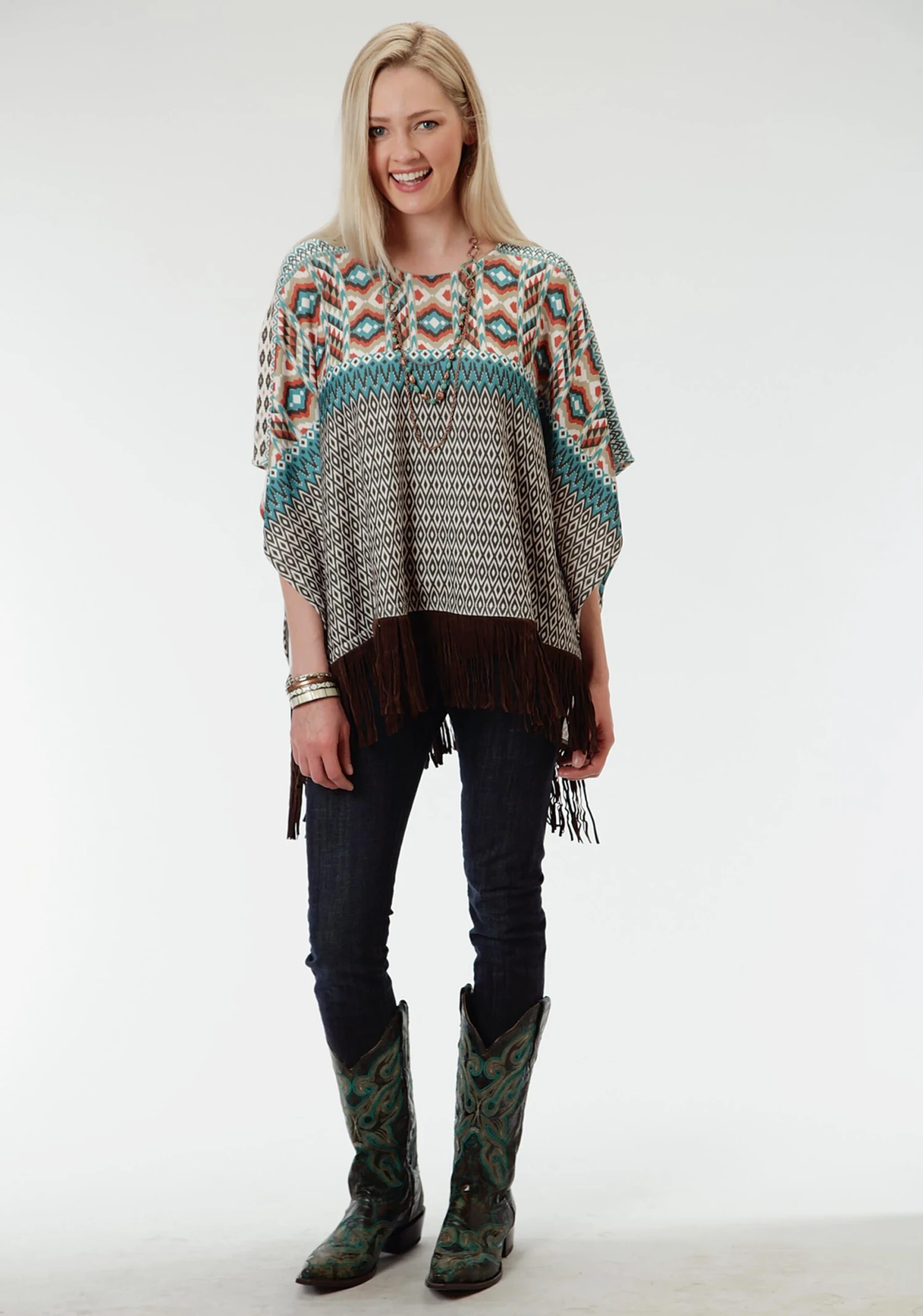 Right On Trend * Great Looking Sweater Jersey Poncho In A Beautiful Aztec Border Print * Faux Suede Fringe Finishes The Hem * Looks Great With Cowboy Boots *