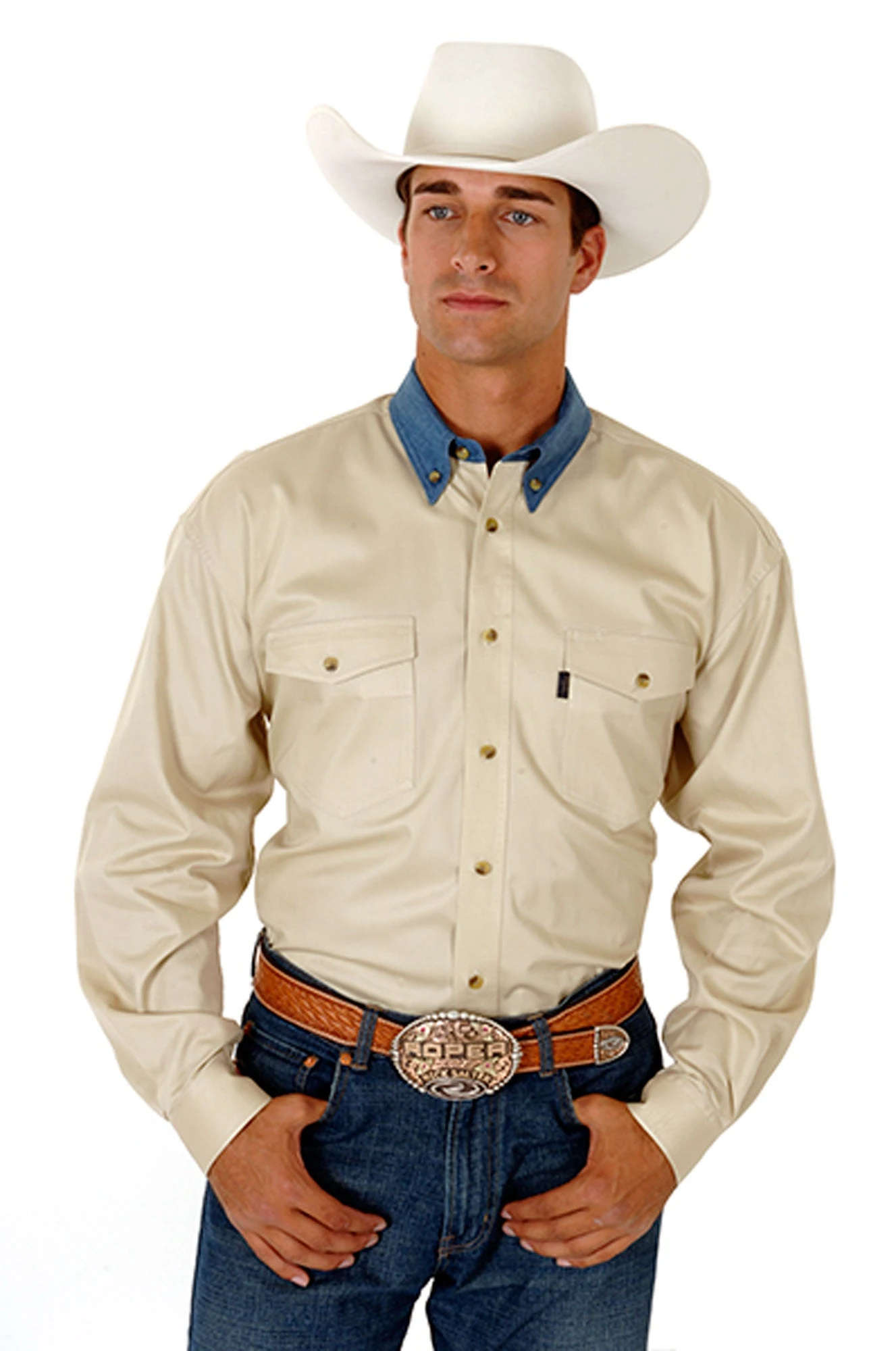 Mens Long Sleeve 6oz Twill Shirt * Two Flap Bttn Pckt * Roper Tab Label On Front Pckt * Contrast Denim Or Twill Bttn Dwn Collar * One Point Back Yoke * Variegated Bttn * Extra Long Tail * Two Bttn Adjustable Cuff * Reg & Tall Mens Sizing *