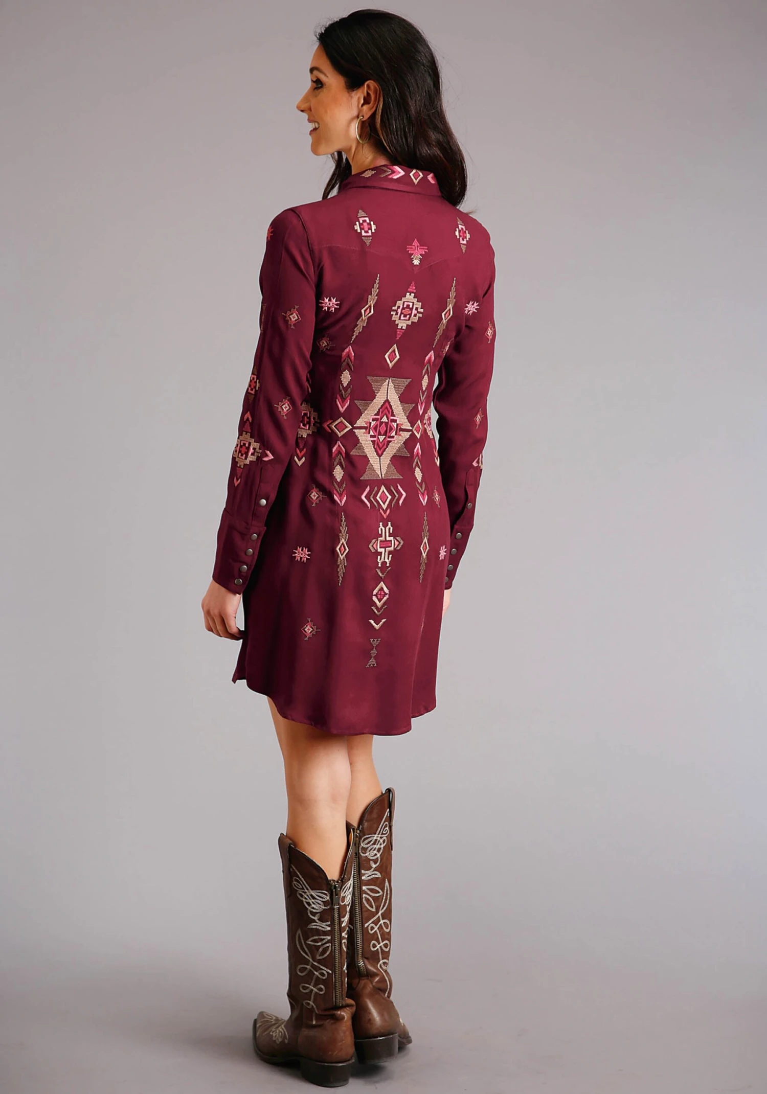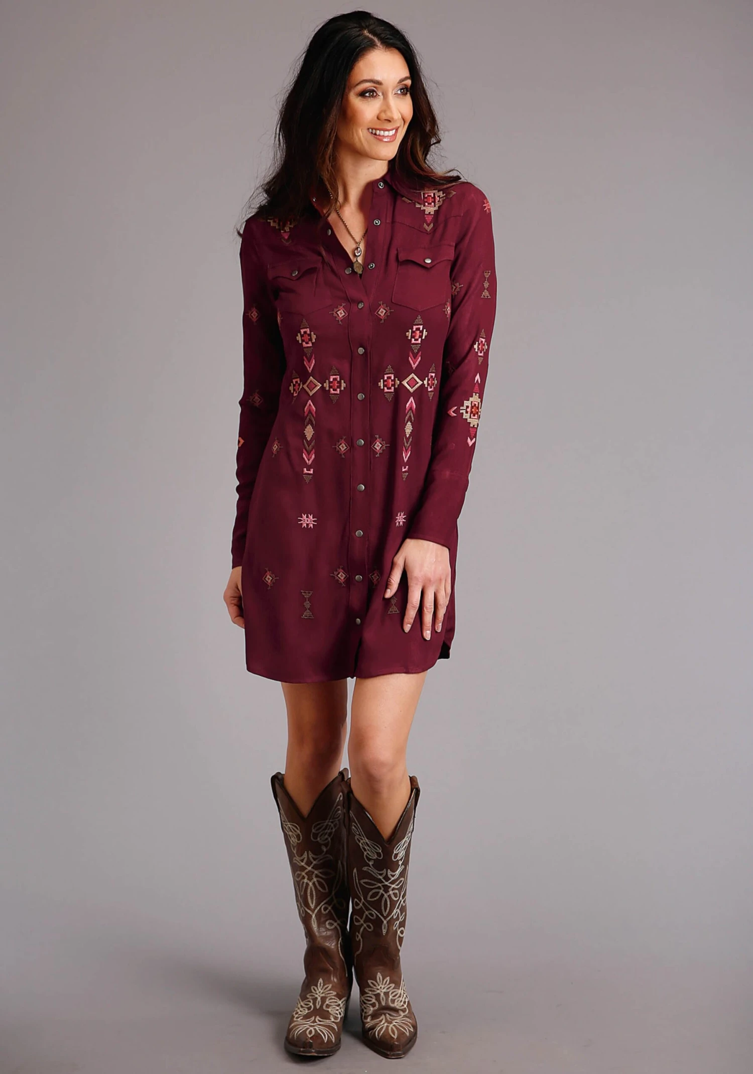 Women’s Deep Wine Rayon Twill Shirt Dress * Single Point Front And Back Yokes * Single Point Pockets And Flaps * 5 Snap Cuffs * Embroidered