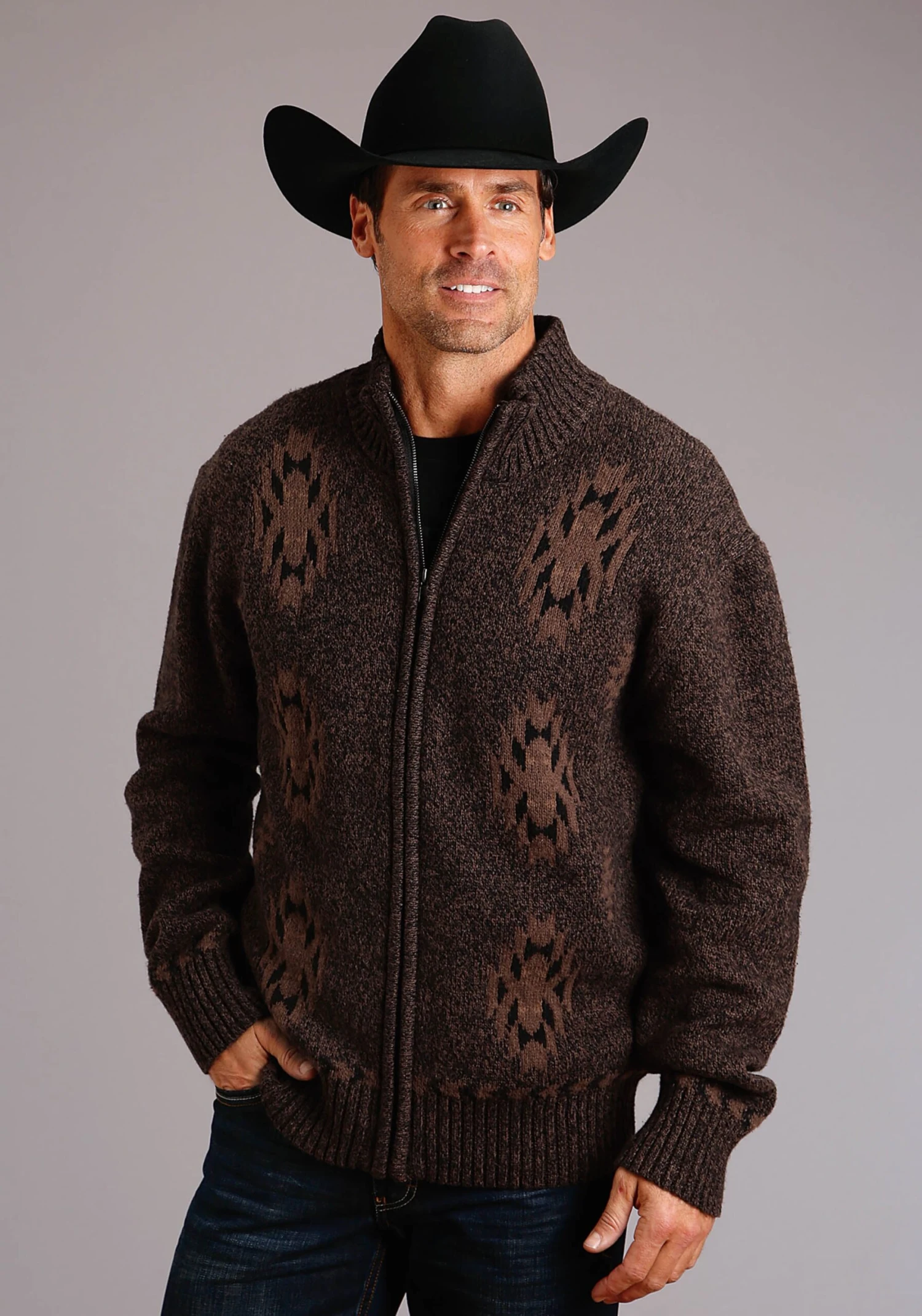 Stetson Vertical Aztec Cardigan * Wool Blend Sweater * Heathered Yarns * Zip Front * Self Knitted Collar, Cuffs, & Waistband * Beautiful Vertical Aztec Pattern Woven Into the Front Of The Garment