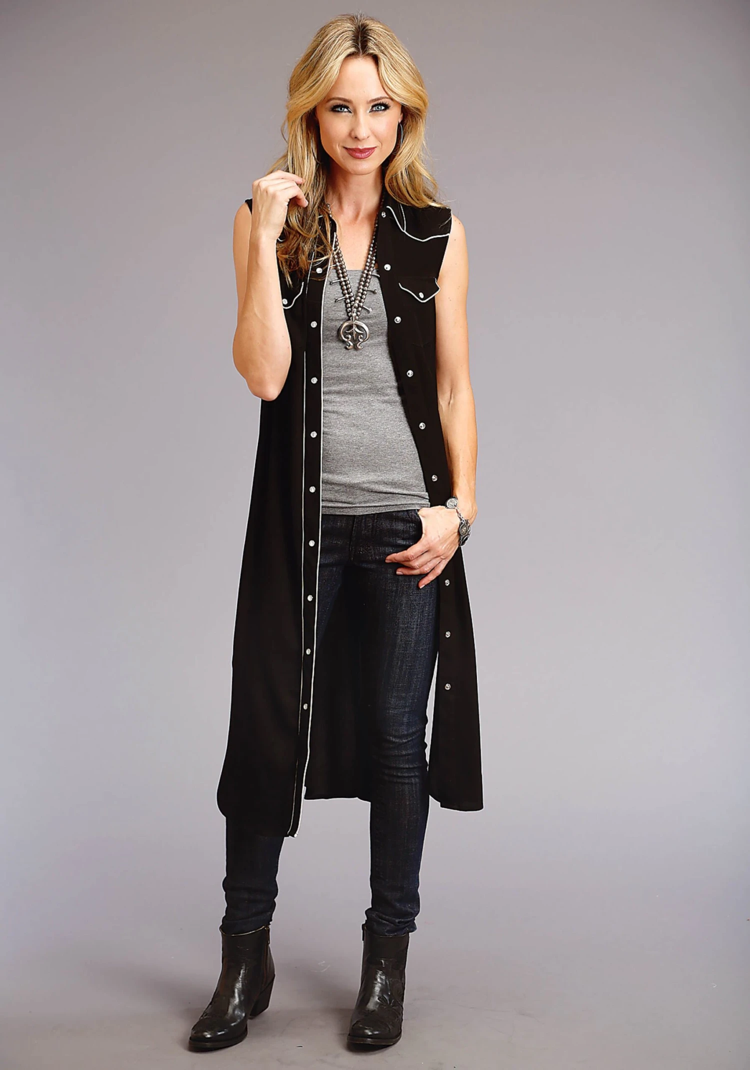 Black Rayon Crepe Sleeveless Western Style Shirt Dress * Single Point Front And Back Yokes * 2 Front Flap Single Point Pockets * Contrast Piping