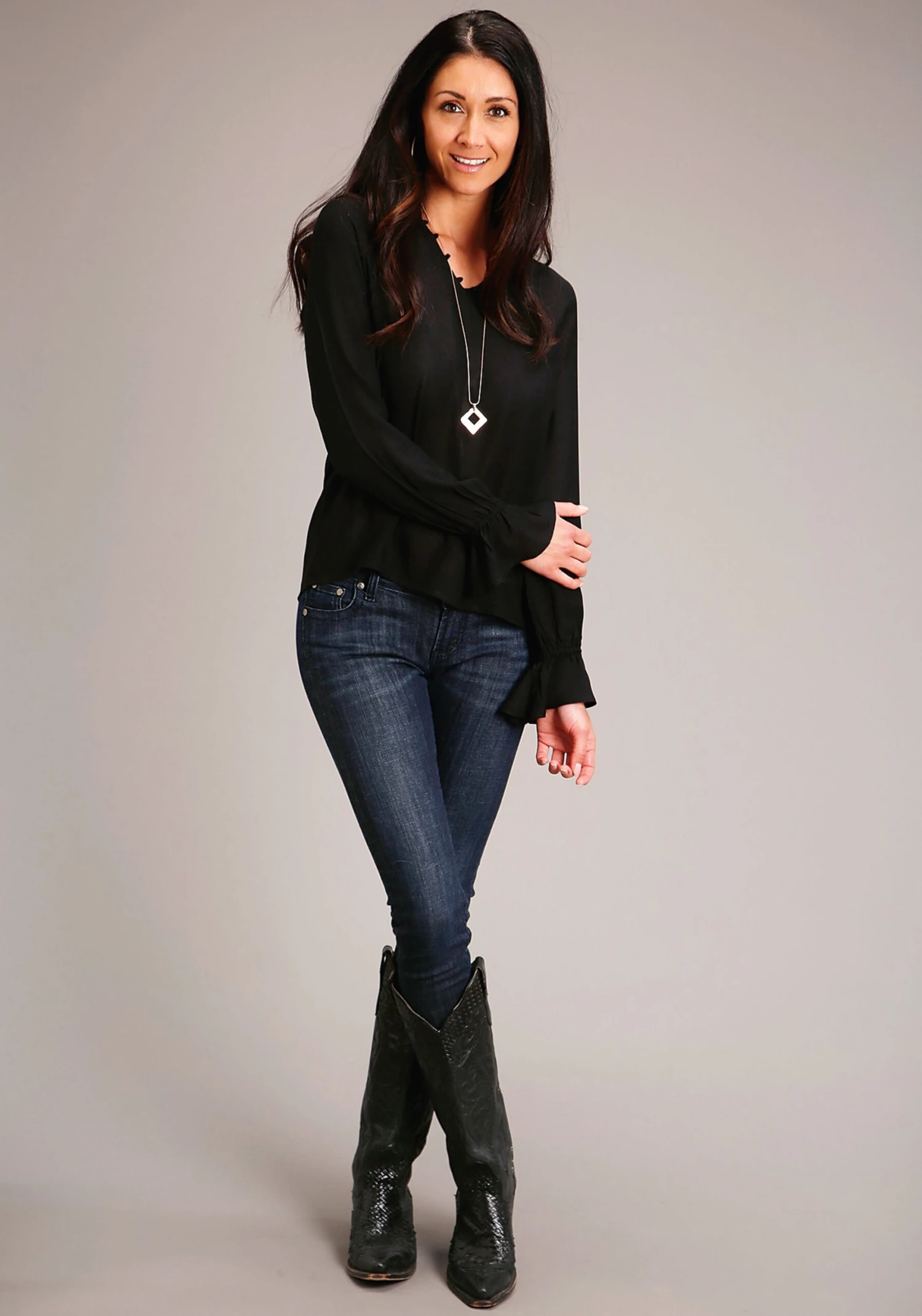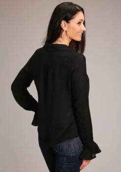Women’s Black Rayon Herringbone Twill Blouse * Long Sleeves With Elastic And Ruffle Cuffs * Fold Over Collar With Self Covered Buttons And Loop Closure At V-Neck Opening * Straight Back Yoke With Gathers