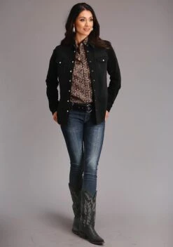 SKU: D2F5B 7883558027511 Category: Women Tags: 98% COTTON / 2% SPANDEX, BOYFRIEND FIT STRETCH DENIM BLOUSE, Color: BLACK, Long Sleeve, Season 3 Group 2, Snap, Solid, STETSON, Stetson Women's Collection- Fall II, STRETCH, STRETCH DENIM, Tops, WOMENS, Woven