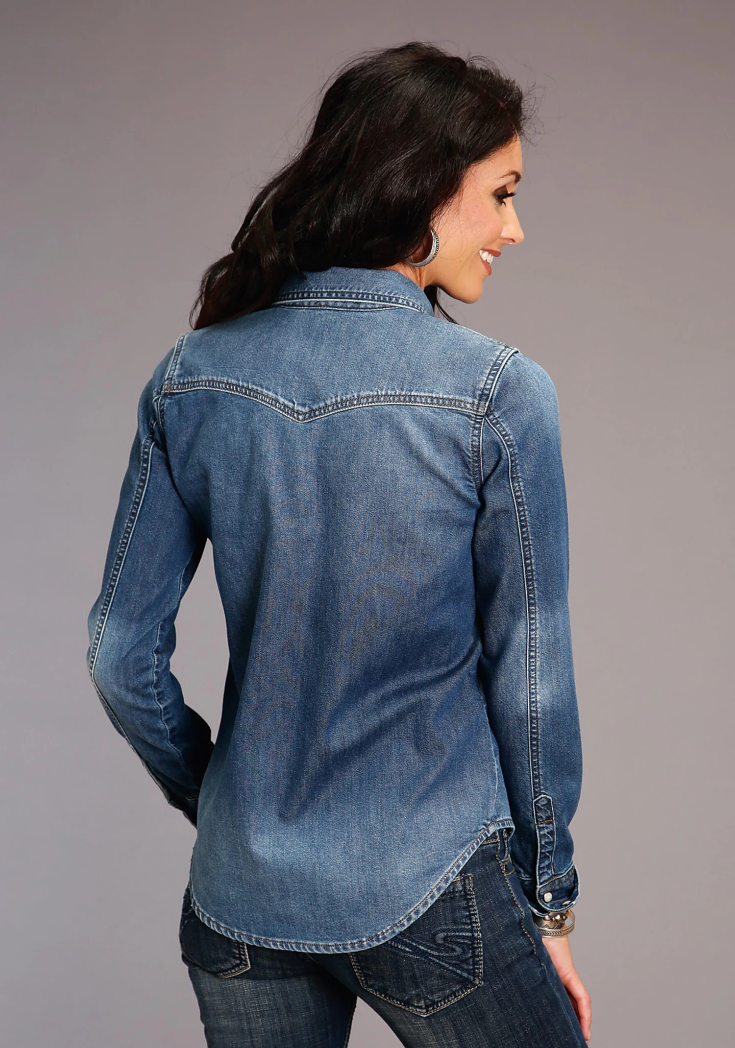Women’s Denim Snp Frt Loose Fitting Blouse * 2 Front Patch Pockets W/Sawtooth Snp Closure Flaps * Deep V Single Pt Frt Yokes & Curved Single Pt Bk Yk Extending Dn Slvs To Cuffs * Gold Contrast Top Stitching * Shirt Tail Bottom Hem