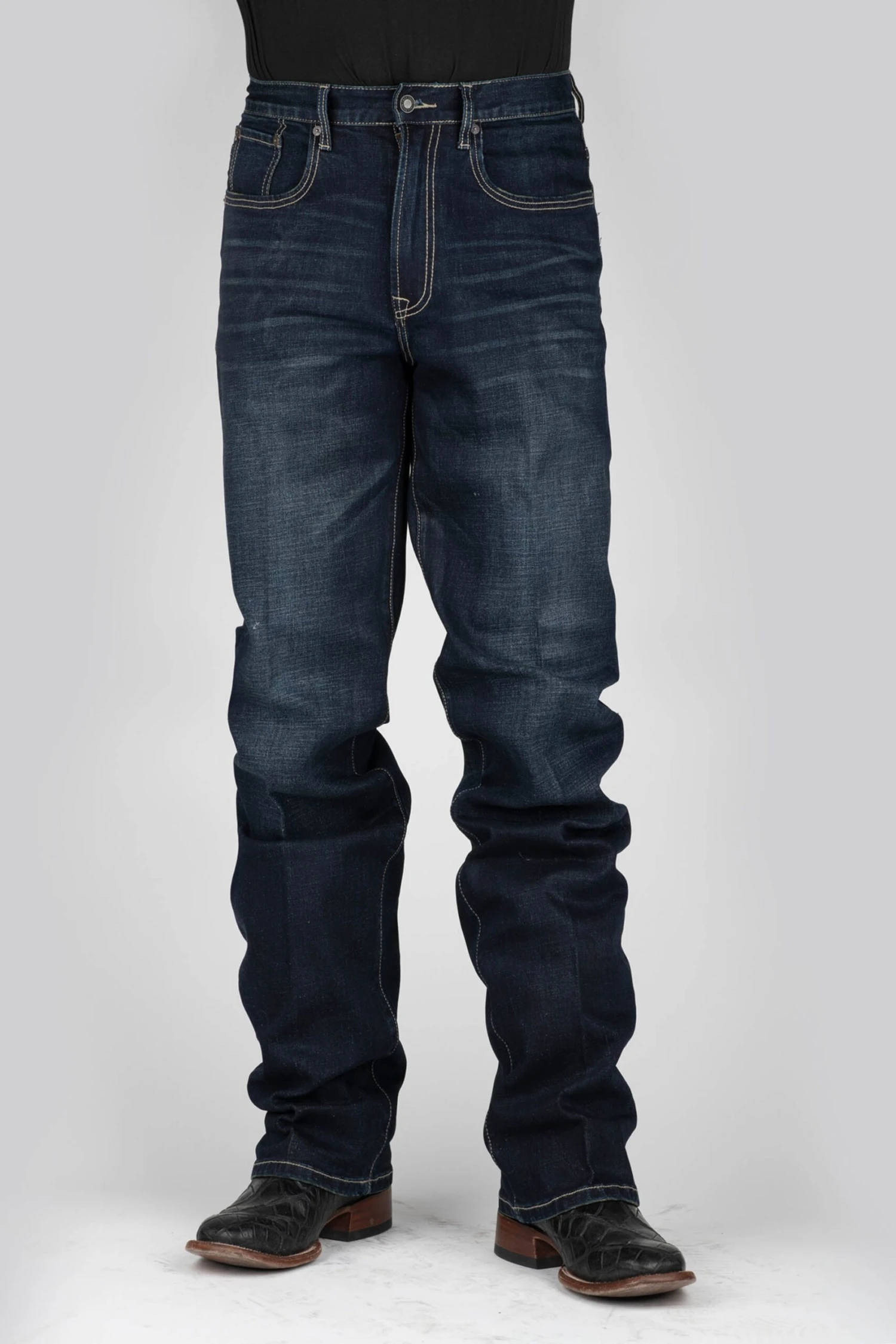 Stretch Denim * Mid Rise * Relaxed Thigh * Bootcut Leg Opening * 5 Pkt Style * Corded Abstract X Shape Deco On Back Pocket * Stetson Branded Button, Rivets And Zippers * Dark Stretch Denim With Light Hand Sanding And Whisker Details