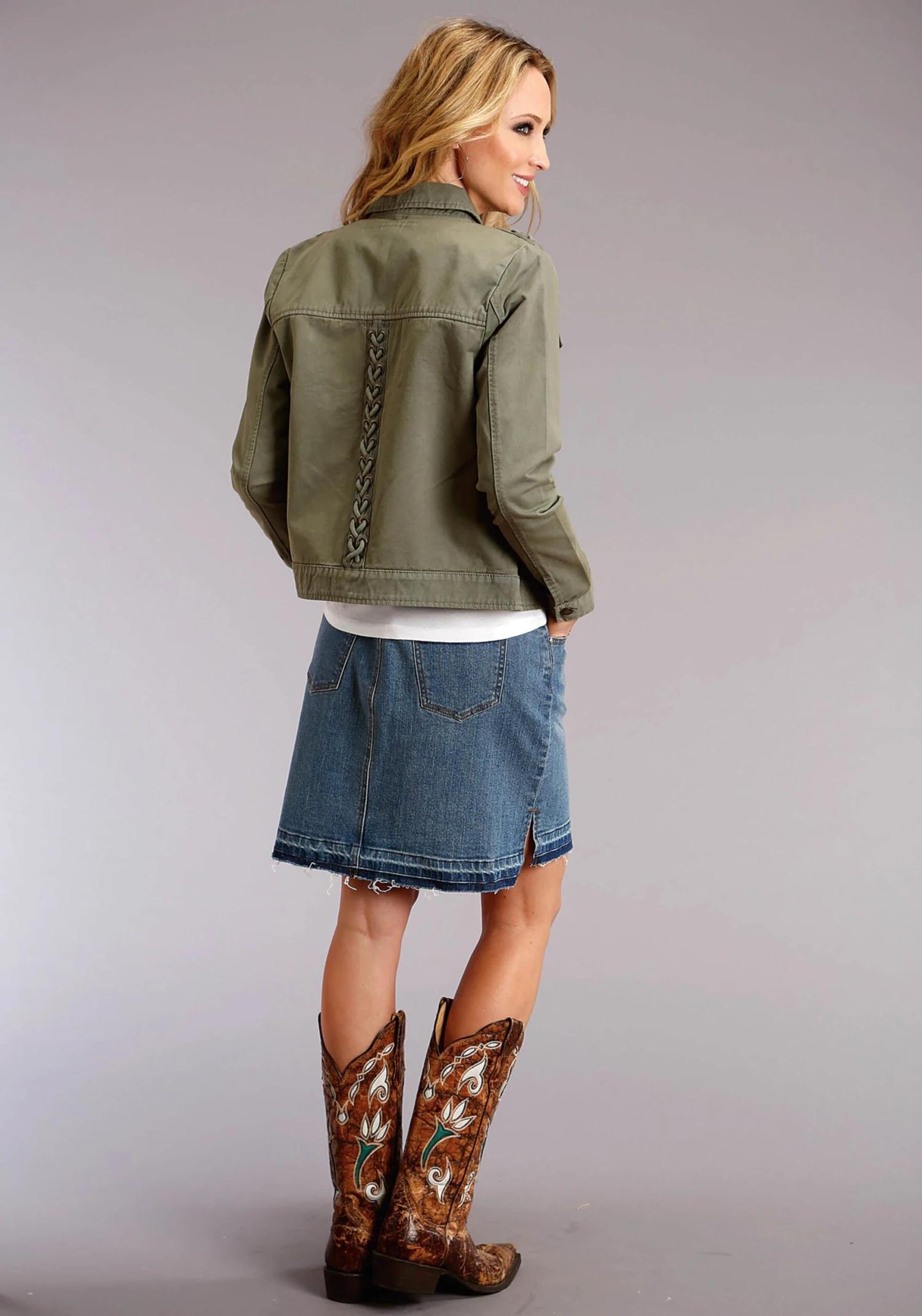 Olive Twill Button Front Jacket * 2 Front Flap Pockets And Welt Side Pockets * Straight Front And Back Yokes * Princess Seams In Front * Twill Tape Detailing With Corded String Ties