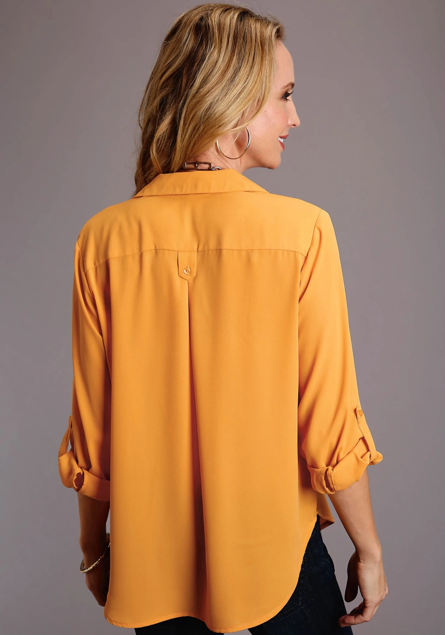 Women’s Gold Crepe ΓΓΈΞ© Sleeve Shirt Blouse * Open V-Collar With 3 Button Placket * 2 Patch Pockets At Chest * Straight Back Yoke With Button Tab And Pleat At Center Back * Button And Tab Sleeve Roll Option * Single Button Closure Cuffs