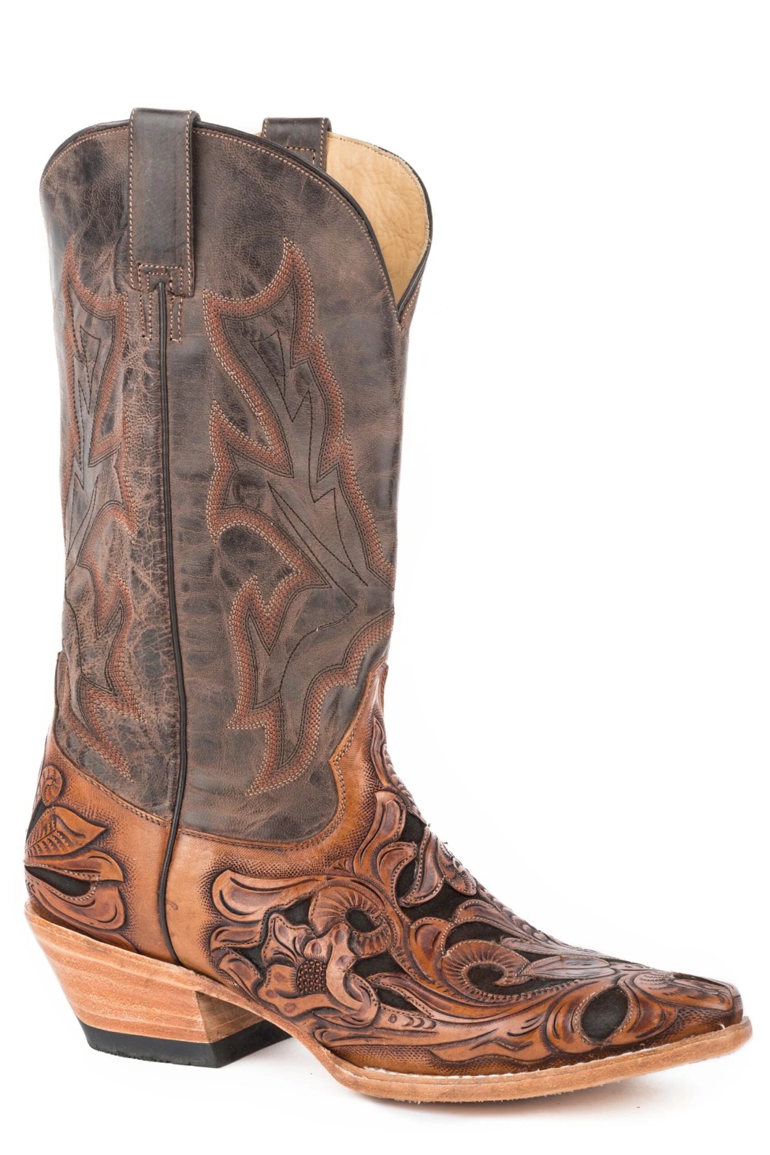 BROWN HANDTOOLED VAMP & HEEL W/INLAYS * OILY BROWN SHAFT * SNIP TOE * SINGLE WELT * 13″SHAFT