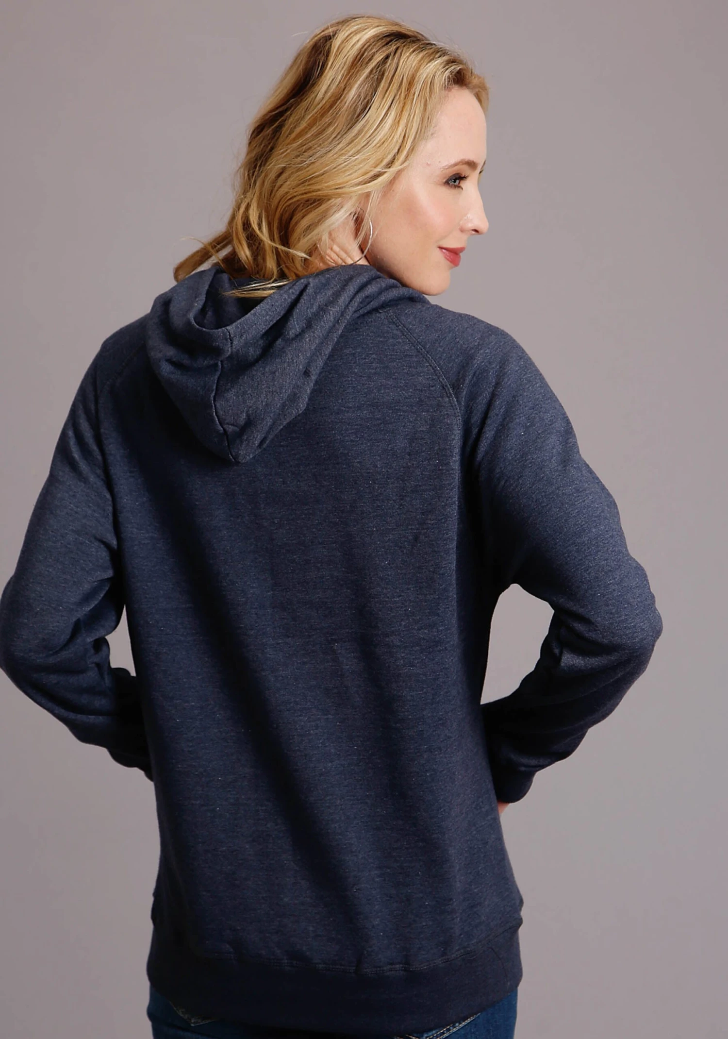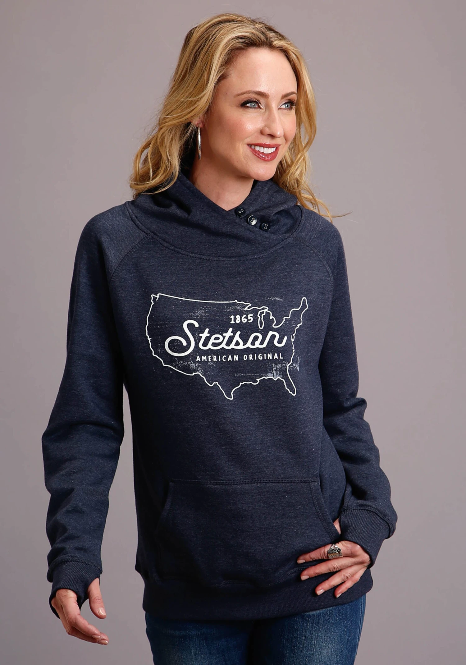 Navy Heather Fleece Knit Hooded Sweatshirt * Asymmetrical Crossover Hood With Button Closure * Raglan Sleeves * Rib Knit Waistband And Cuffs With Thumbholes * Front Kangaroo Pocket * White “Stetson” Script USA Map Screen Print On Front