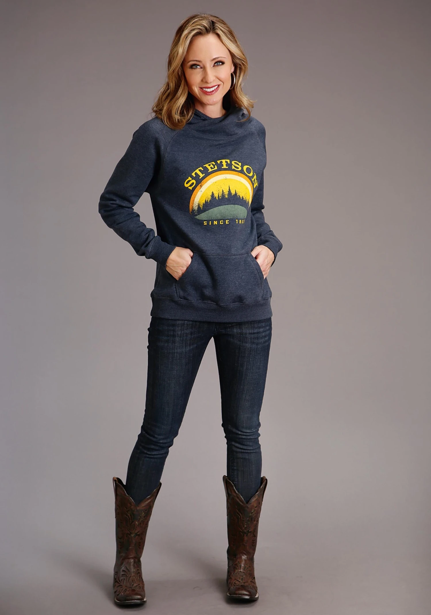 Navy Heather Long Sleeve Hooded Sweatshirt * Asymmetrical Crossover Hood * Rib Knit Waistband And Cuffs With Thumb Holes * Kangaroo Pocket * “Stetson” Sunset And Trees Screen Print Embellishment On Front * Garment Washed For Softness