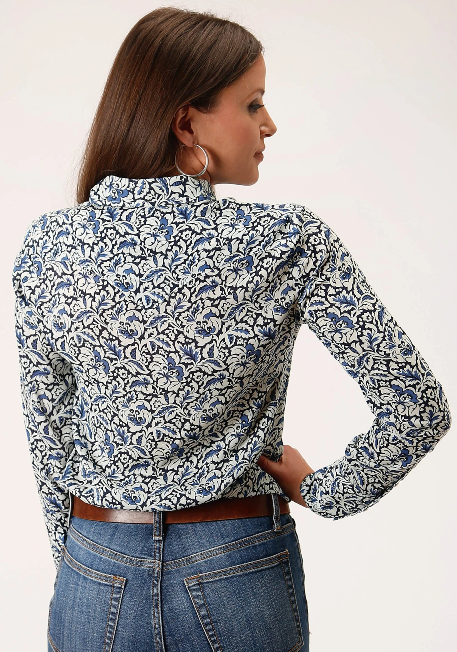 Women’s “Indigo Tapestry” Print Rayon Western Long Sleeve Blouse * Single Point Deep Curved Front And Back Yokes * Single Point Left Chest Patch Pocket