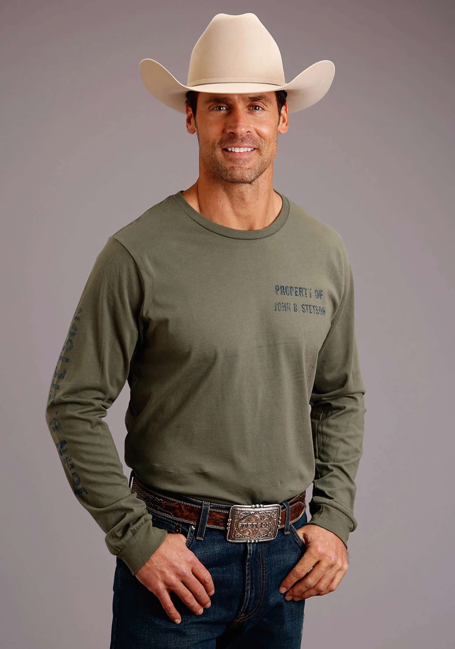 Men’s Green Long Sleeve Jersey T-Shirt * Crew Neck W/Rib Knit Collar Band * Garment Washed For A Super Soft Hand * Cover Stitched Hem * Navy “John B. Stetson” Left Chest Screen Print And Right Sleeve Screen Print * 100% Cotton
