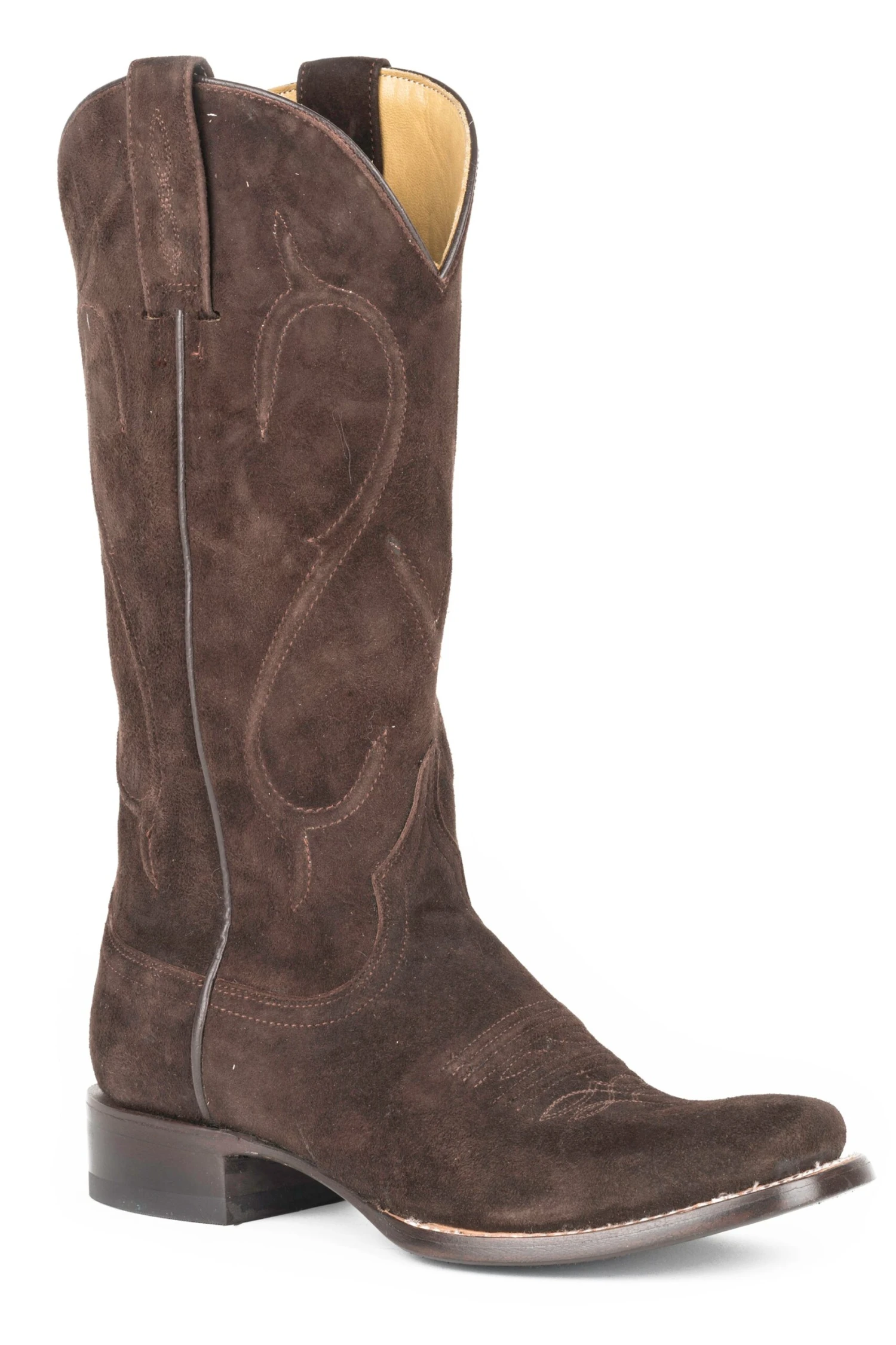 Chocolate Brown Goat Rough Out Vamp And 13″ Shaft * Unique Corded Shaft Design * Narrow Square Toe * All Leather Sole * Lemonwood Peg And Brass Nail Construction * Walking Heel * All Leather Lining * Cushioned Comfort Insole *