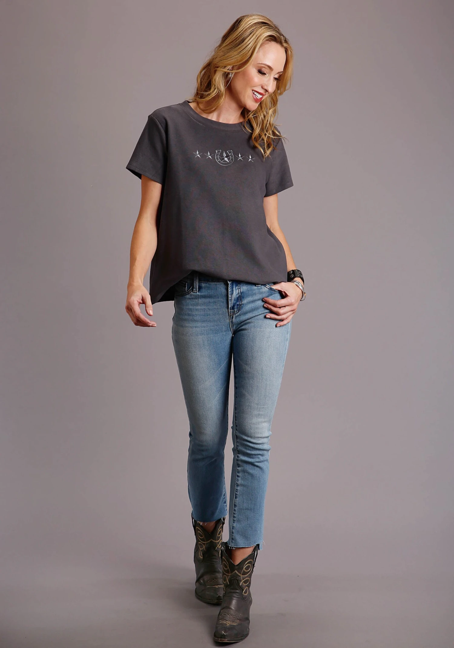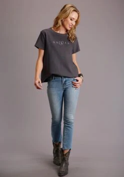 Women’s Charcoal French Terry T-Shirt * Self Neckline * Straight Hemline * Short Sleeves * Embroidered