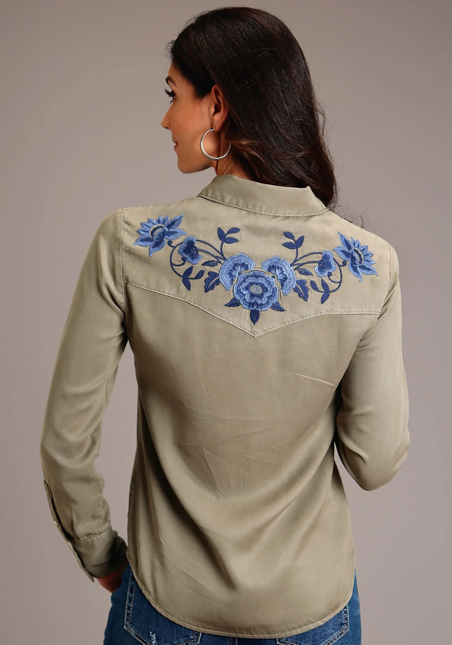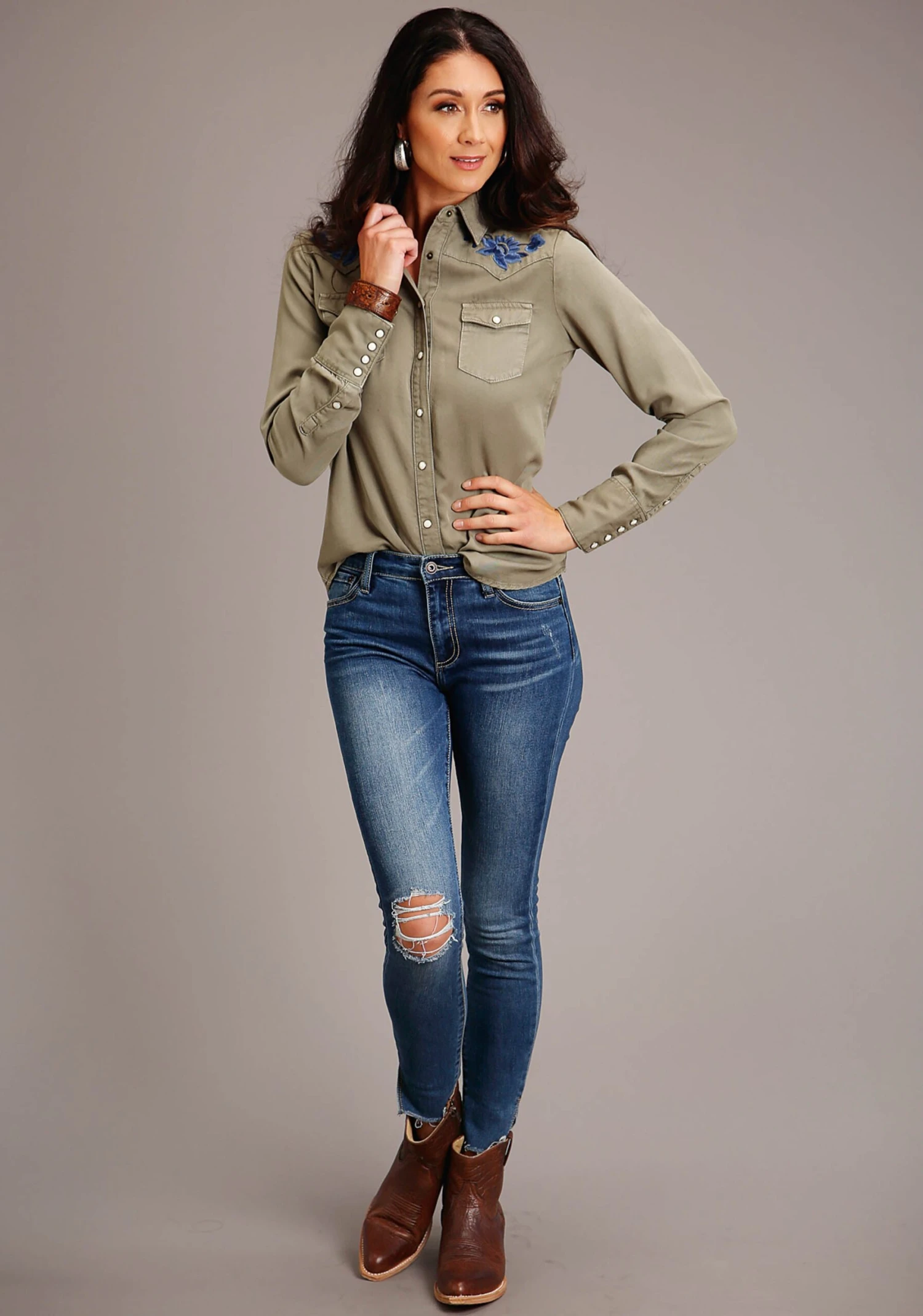 Women’s Olive Lyocell Western Style Blouse * Boyfriend Fit * Single Point Curved Front And Back Yokes * Front Faux Pocket Flaps * Snap Front * Self Piping * Embroidered