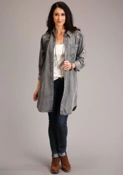 Women’s Black Wash Lyocel Denim Long Sleeve Shirt Dress * Fold Collar And Snap Front * Drop Shoulders, Straight Back Yoke, And Single Point Left Chest Patch Pocket * Single Snap Cuffs * Self Tie At Waist