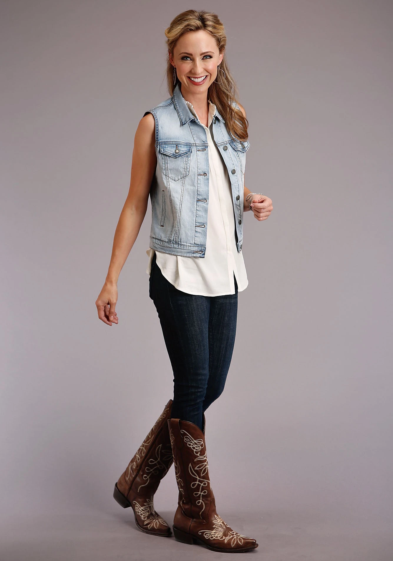Denim Jacket Style Vest * Welt Hand Pockets * Single Point Chest Pockets And Pocket Flaps * Front And Back Seaming * Straight Front And Back Yokes * Back Waist Tabs