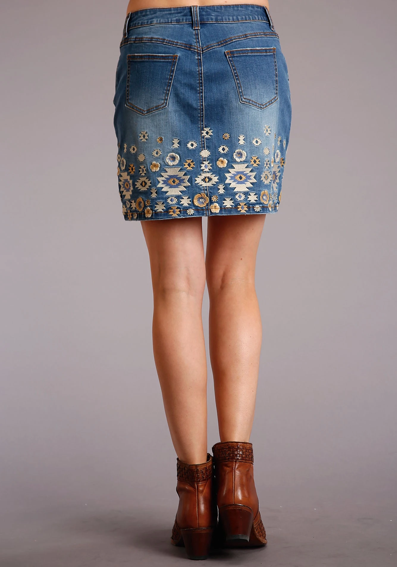 Denim 5 Pocket Skirt With Embroidery * Finished Hem * Above Knee Length * Single Point Back Pockets