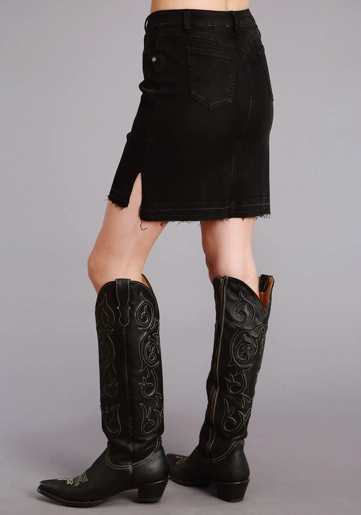 Black Denim 5-Pocket Skirt * Raw Edge Slight Hi-Low Hem * Above Knee Length * Single Point Back Pockets * Side Slits