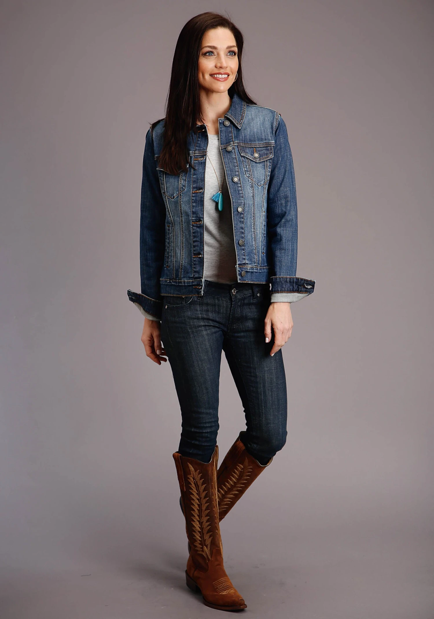 Women’s Denim Jacket With Welt Pockets * Front And Back Seams * Drop Shoulders & Straight Front And Back Yokes * Patch Pockets And Flaps * Back Waist Tabs