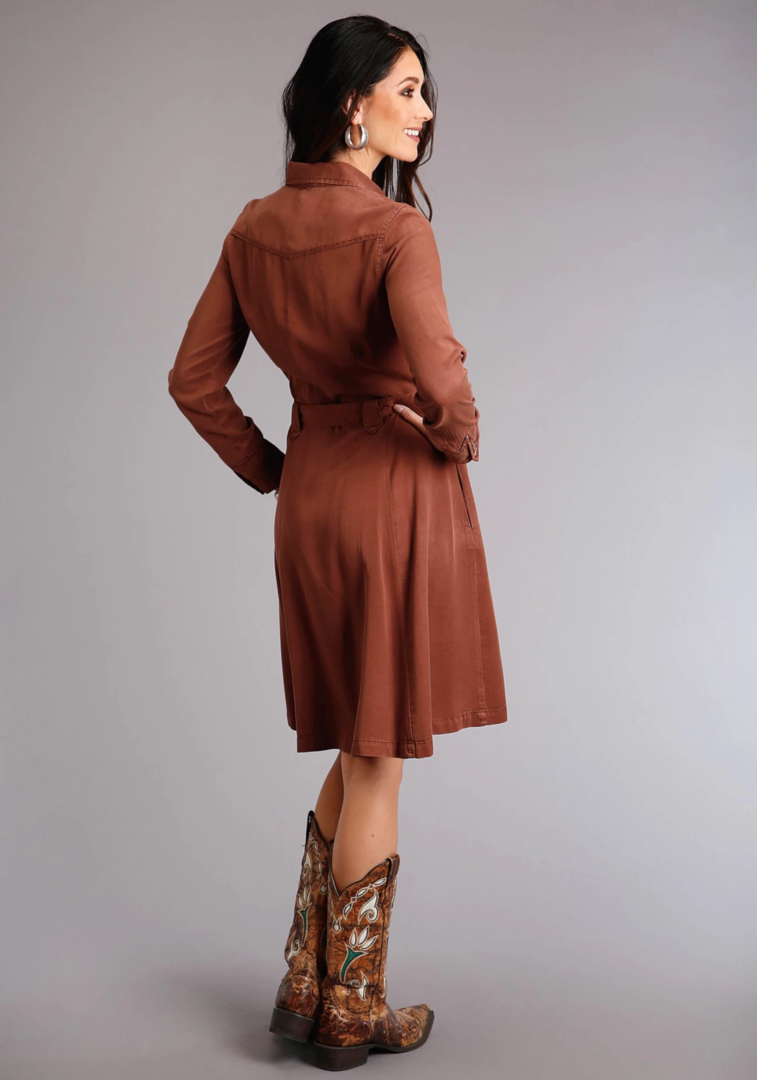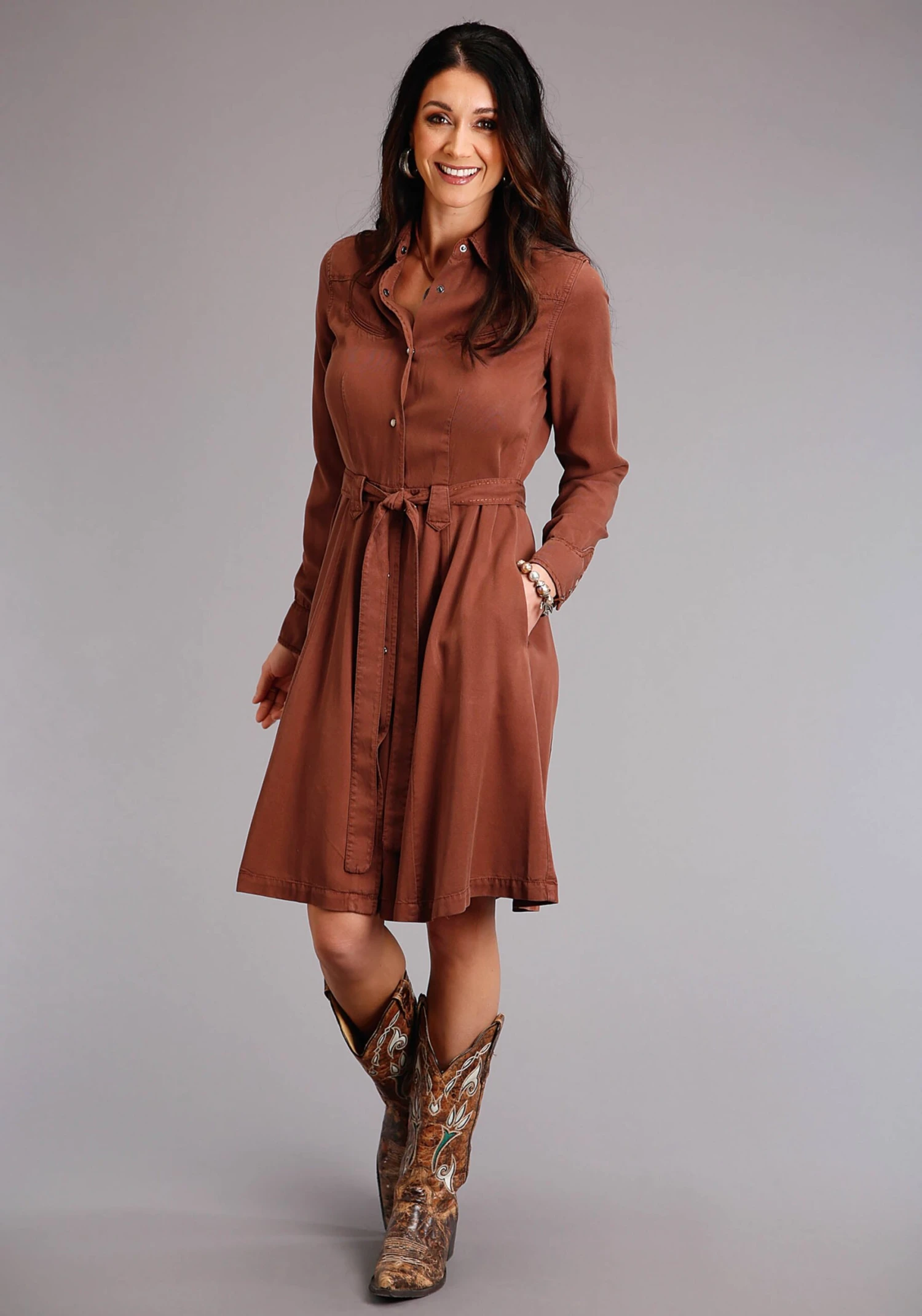 Women’s Tobacco Lyocel Twill Western Style Dress * Single Point Front And Back Yokes * Smile Pockets * Curved Snap Cuffs * Side Seam Pockets * Full Front Snap Placket * Self Tie Belt And Belt Loops