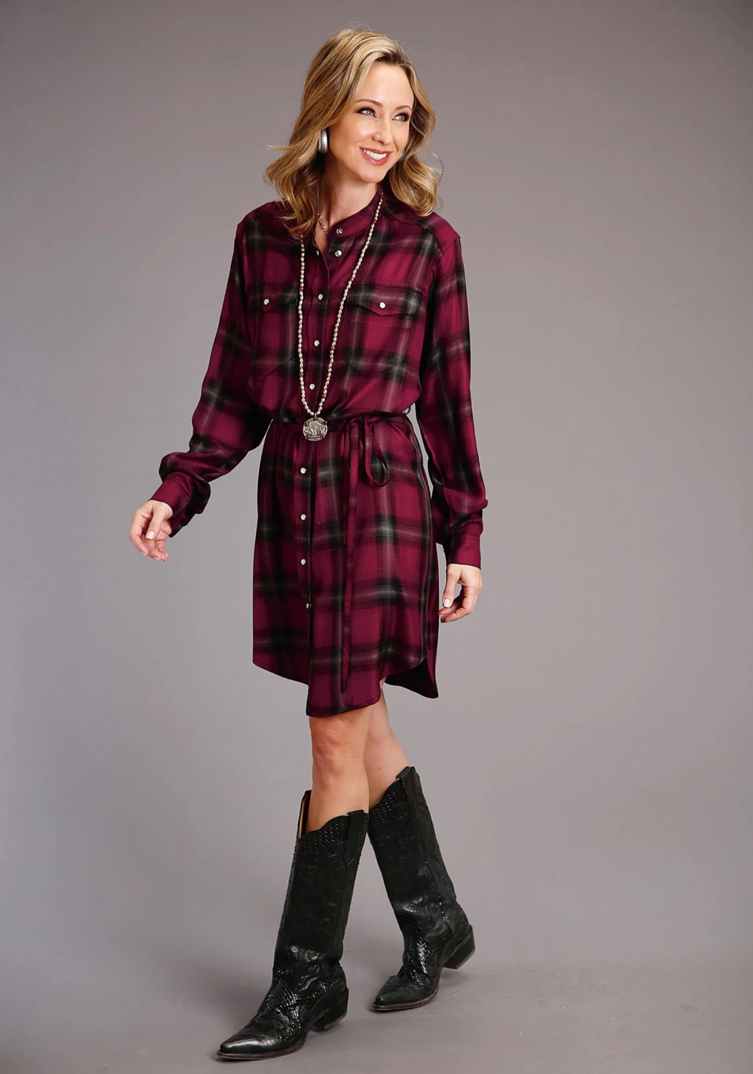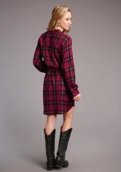 Women’s Brushed Rayon Plaid Long Sleeve Shirt Dress * Stand Collar And Snap Front * Drop Shoulders, Straight Back Yoke, And Single Point Front Patch Pockets With Snap Flap Closures * Single Snap Cuffs * Self Tie At Waist