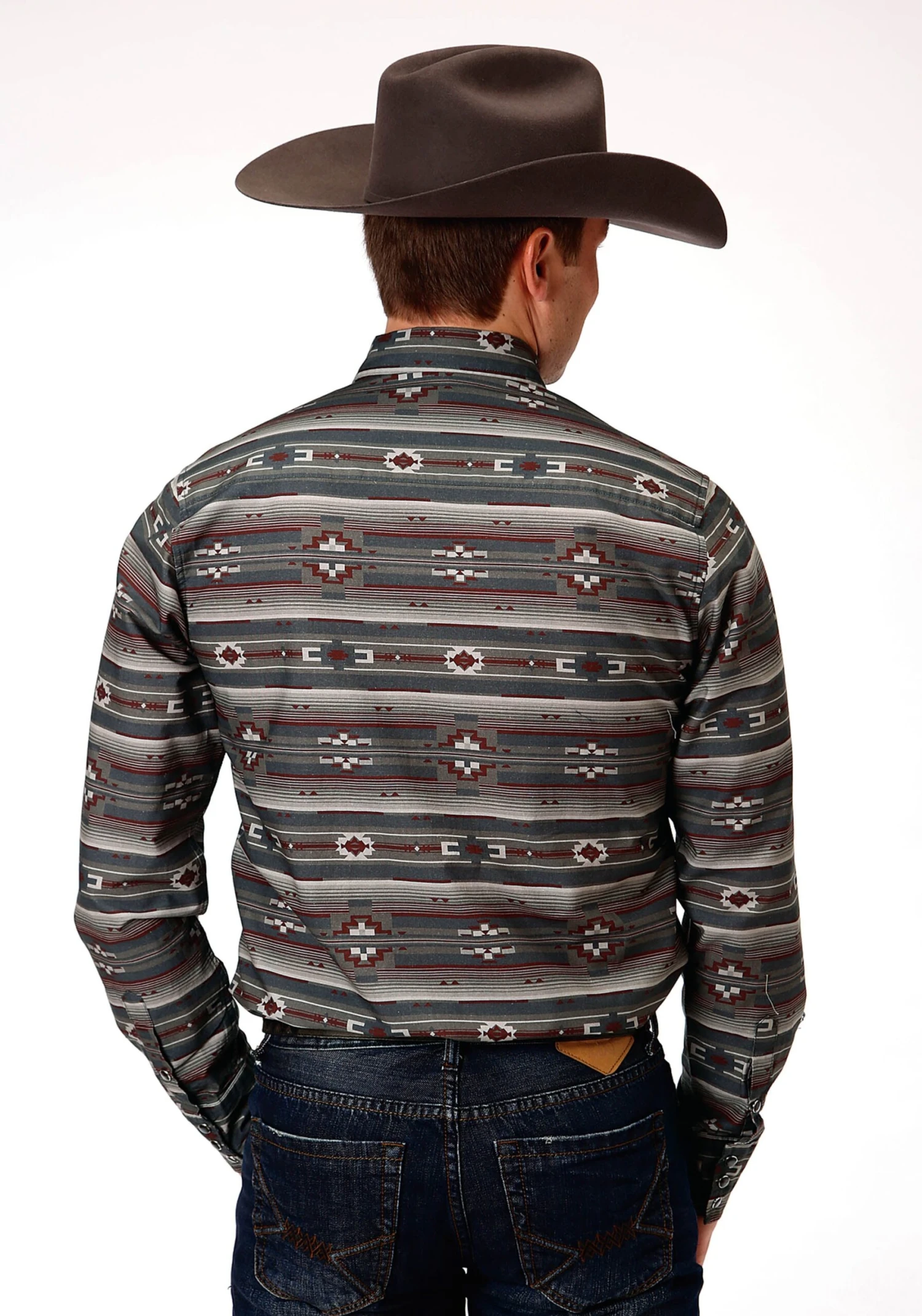 Guy’s Horizontal Aztec Print * 100% Cotton Poplin * 1 Pt Front Yokes * Straight Back Yoke * Square Pockets & Flaps * Metal Logo I.D. Tag * Grey Pearl Snap Front * 3 Snap Cuff * Garment Washed