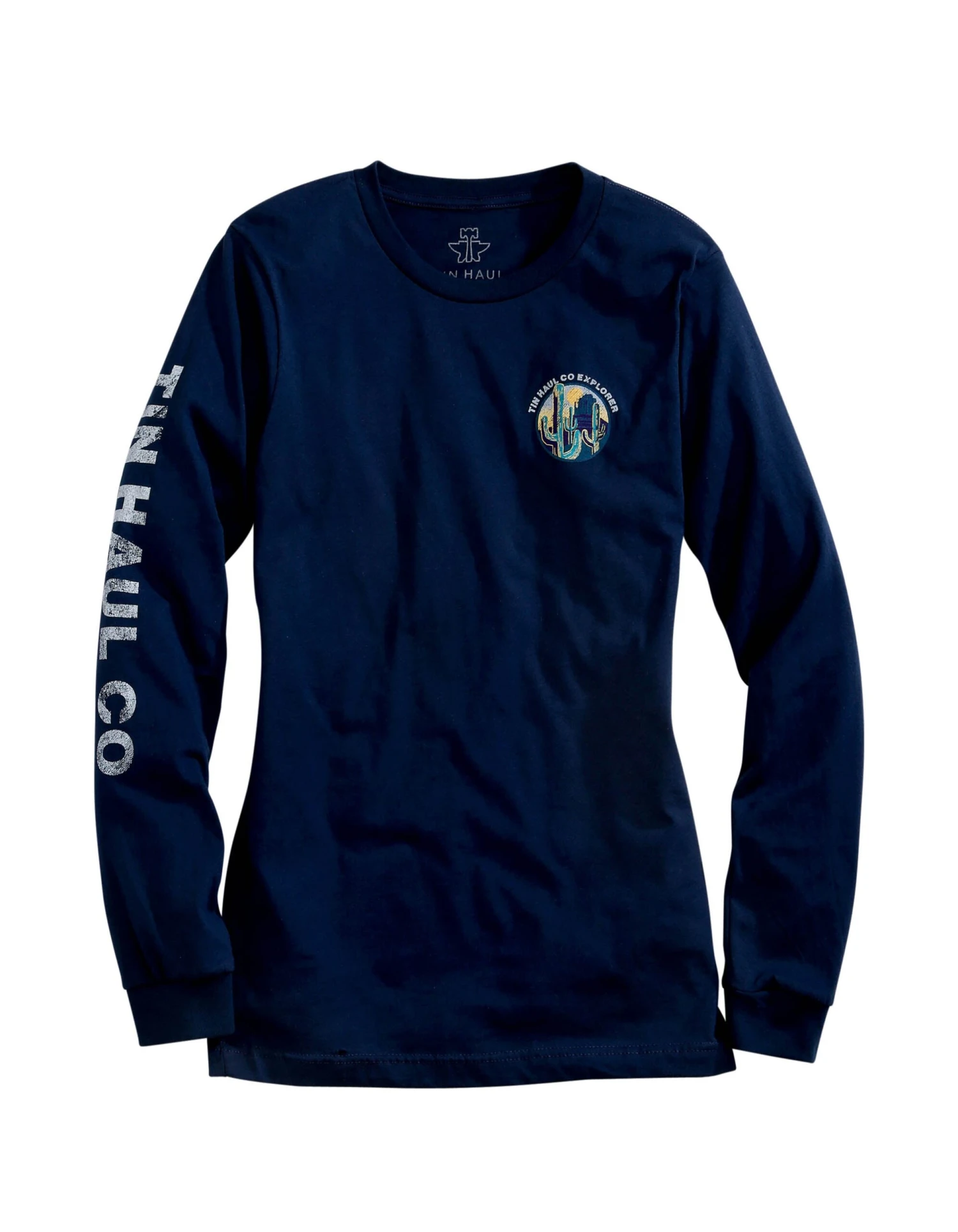 Navy Long Sleeve T-Shirt * Crew Neck with Self Collar Band * Garment Washed for a Super Soft Hand * Circular “Tin Haul CO Explorer” Cactus Screen Print Embellishment on Left Chest and Back * “Tin Haul Co” Screen Print Down Right Arm *
